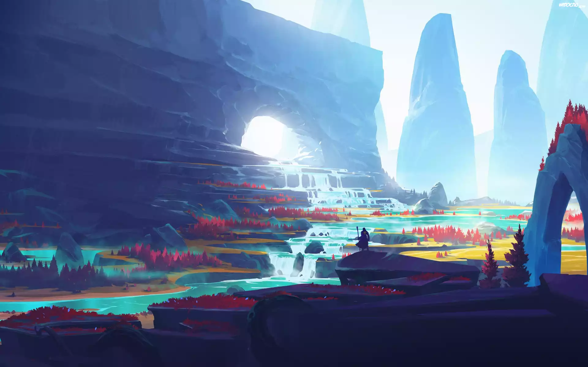 Grafika, Wodospad, Skały, Człowiek, Rzeka, Góry, Fantasy