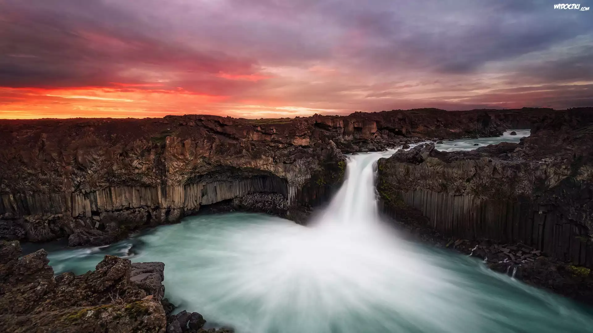 Zdjęcia, Islandia, Wodospad Aldeyjarfoss, Skały, Bazaltowe, Zachód słońca