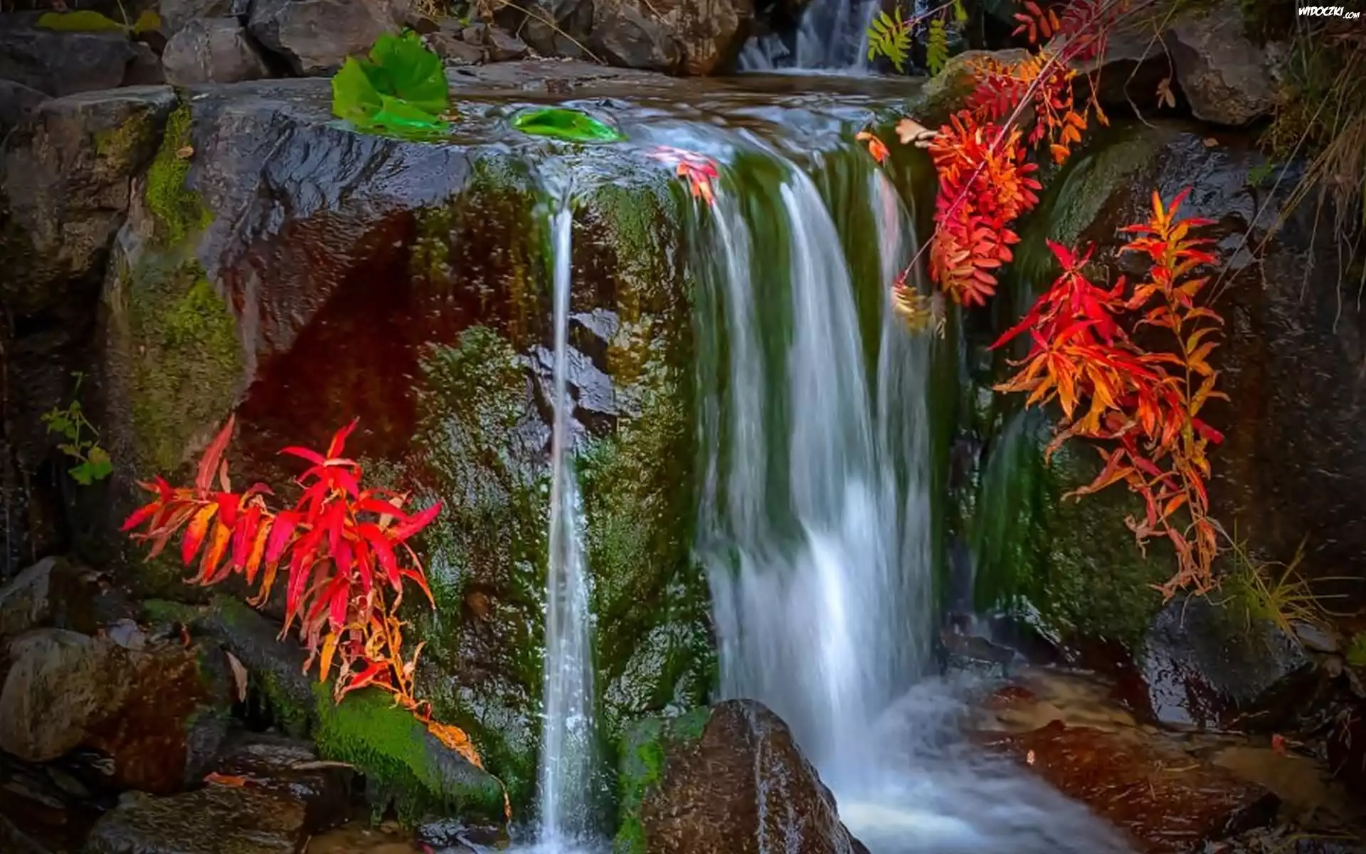 Zdjęcia, Wodospad, Skały, Jesienne, Liście