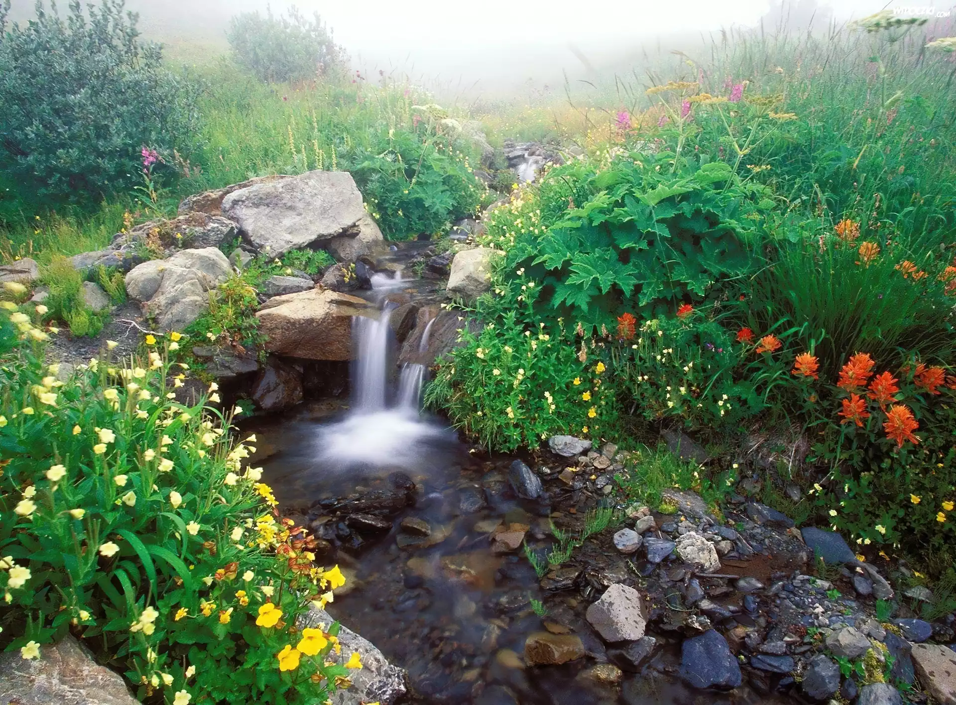 Zdjęcia, Wodospad, Strumyk, Kamienia, Kwiaty