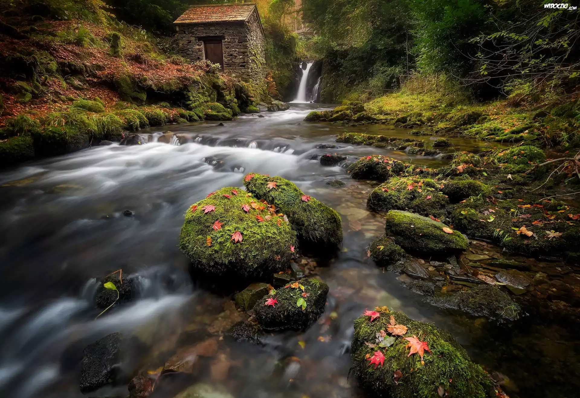 Wodospad, Rzeka, Omszałe, Kamienie, Liście