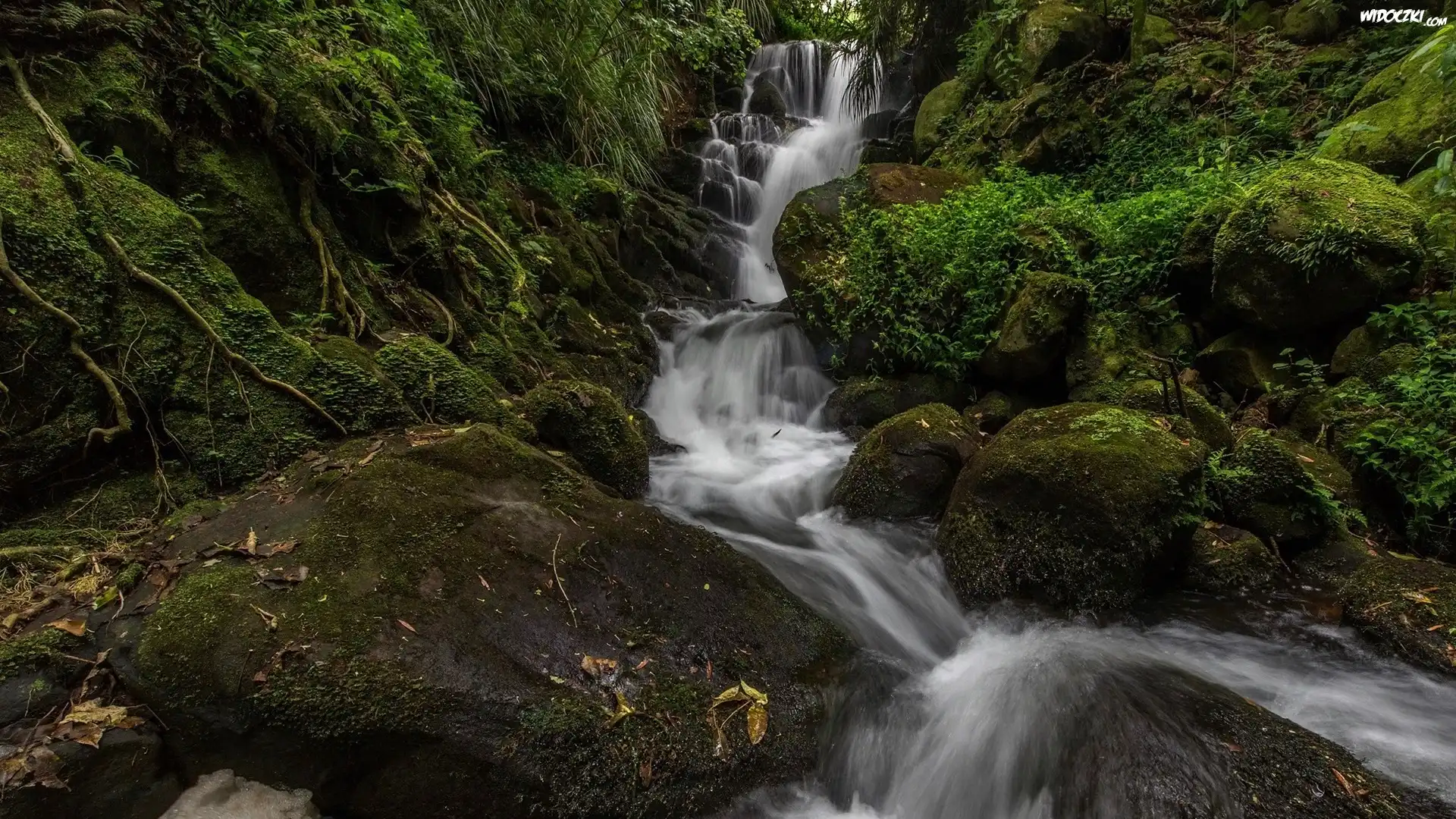 Zdjęcia, Wodospad, Strumień, Omszone, Kamienie, Rośliny