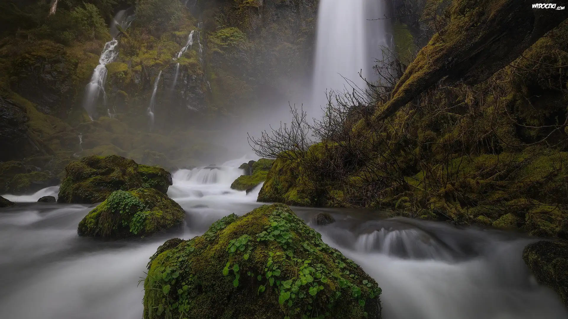Wodospad, Las, Roślinność, Skały, Kamienie, Omszałe
