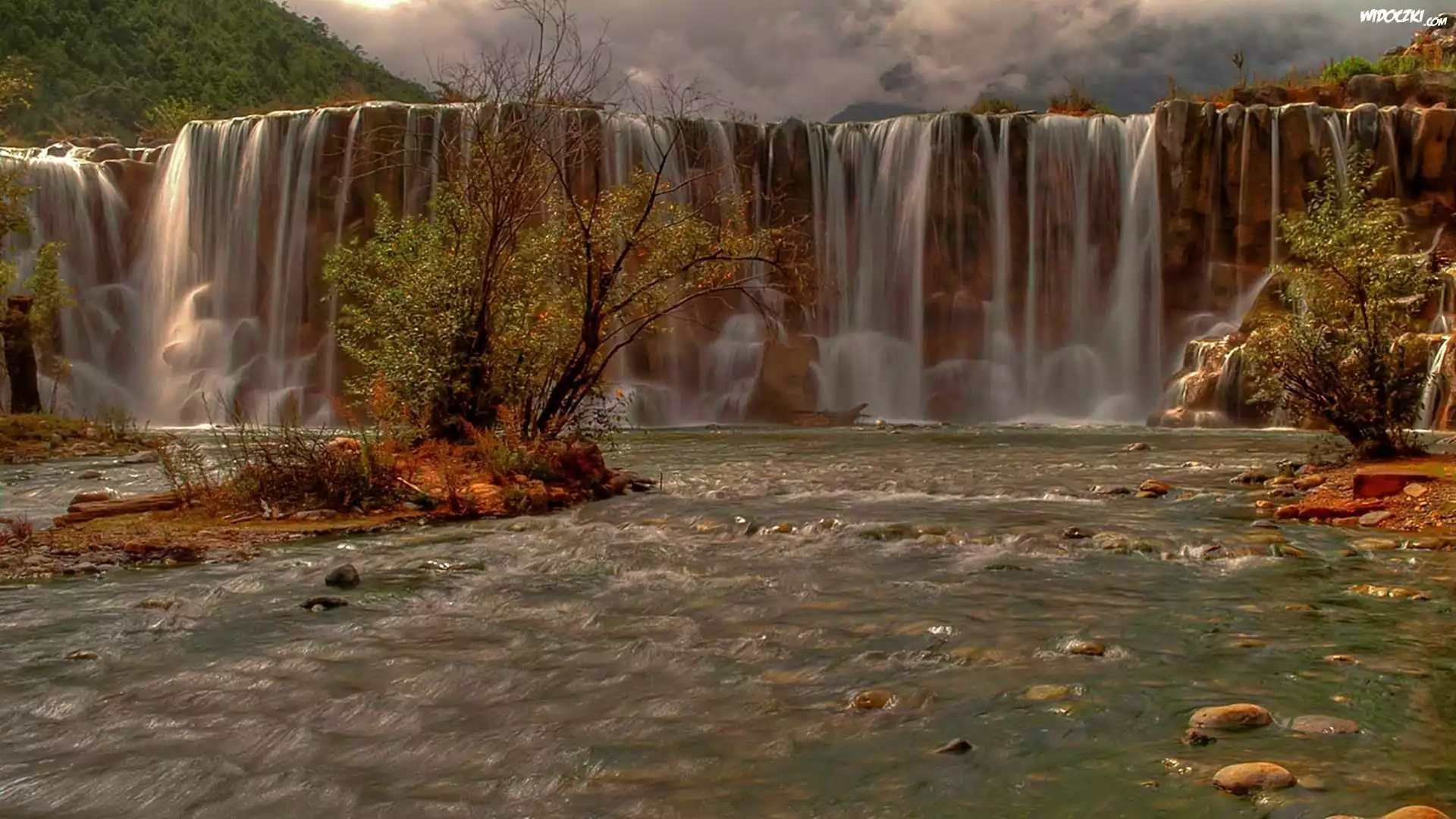 Zdjęcia, Wodospad, Rzeka, Kamienie, Drzewa