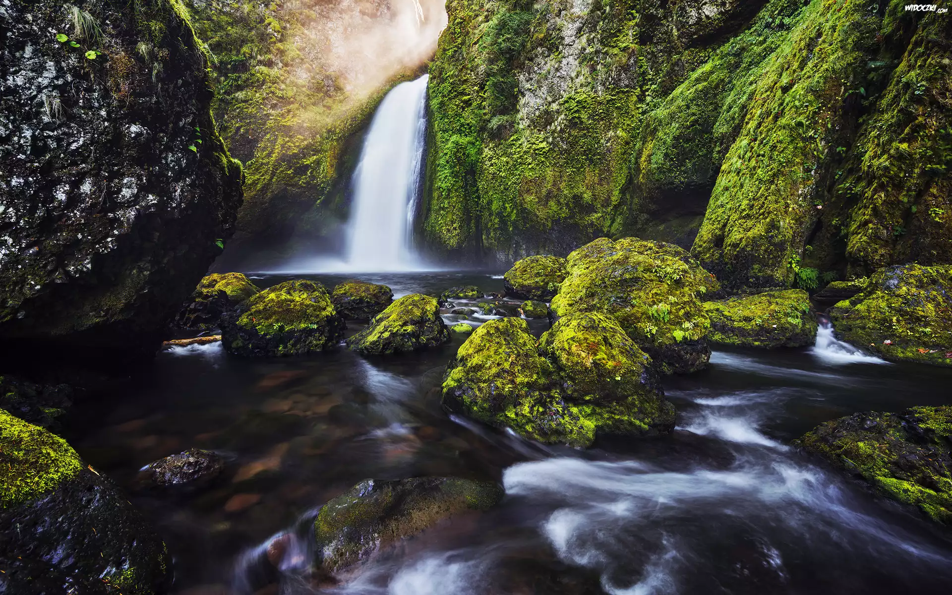 Zdjęcia, Wodospad, Skały, Rzeka, Omszałe, Kamienie, Roślinność