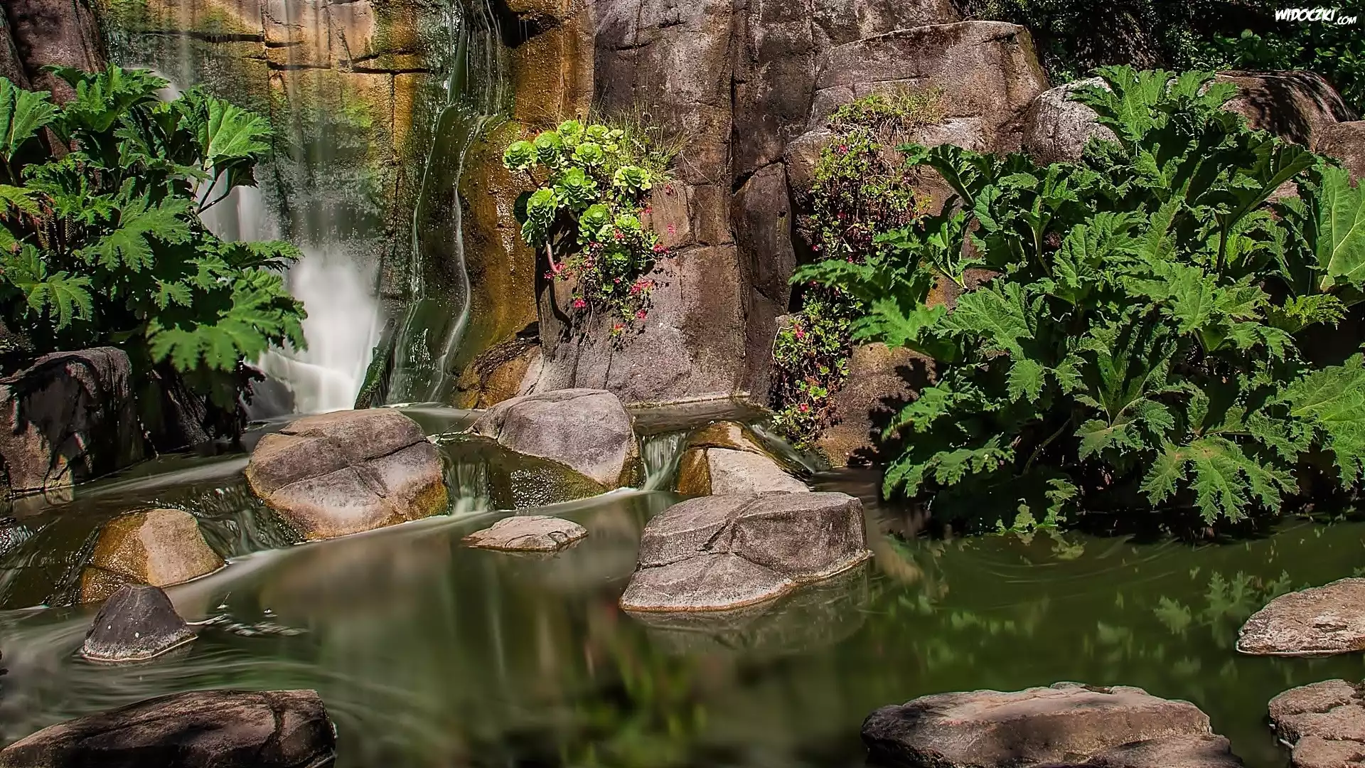 Zdjęcia, Wodospad, Skały, Kamienie, Rośliny