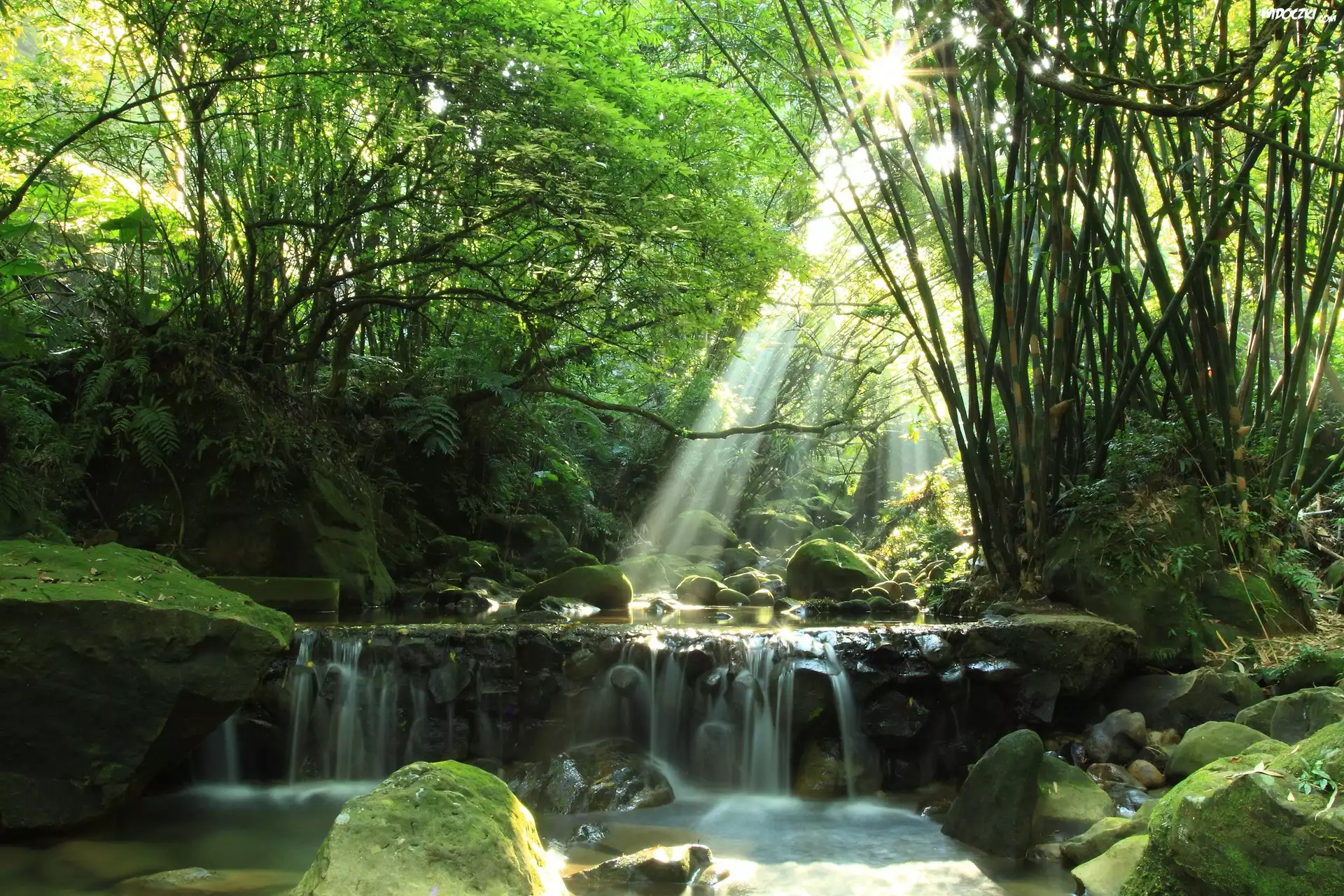 Wodospad, Promienie, Słońca, Kamienie, Drzewa