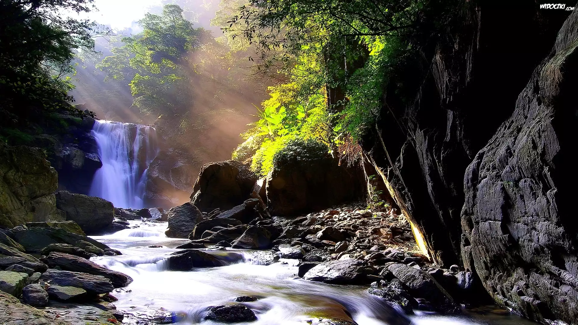 Zdjęcia, Wodospad, Woda, Kamienie, Drzewa