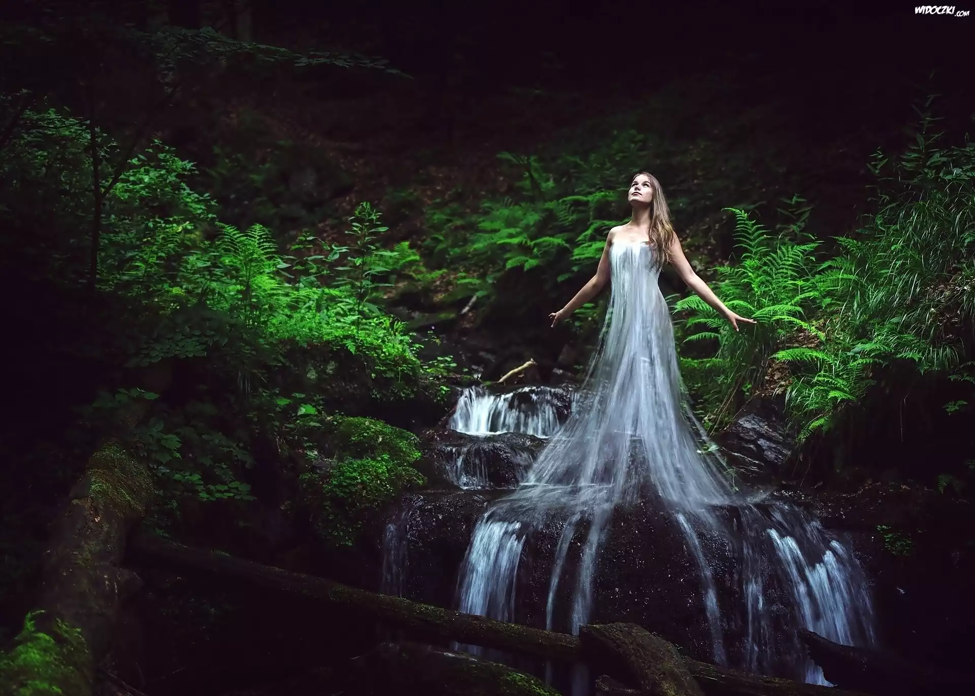 Zdjęcia, Kobieta, Wodospad, Roślinność