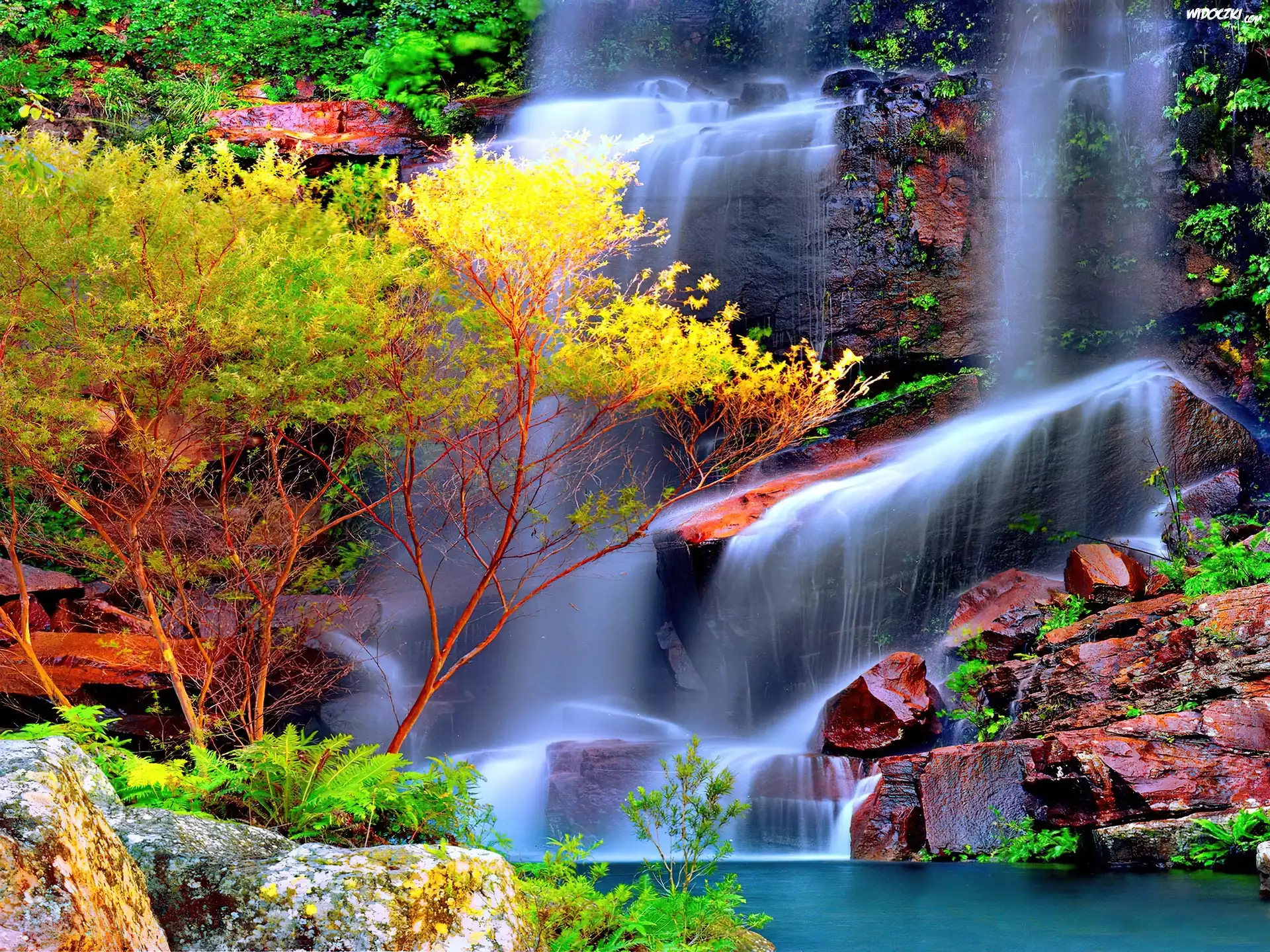 Zdjęcia, Wodospad, Skały, Kolorowe, Rośliny