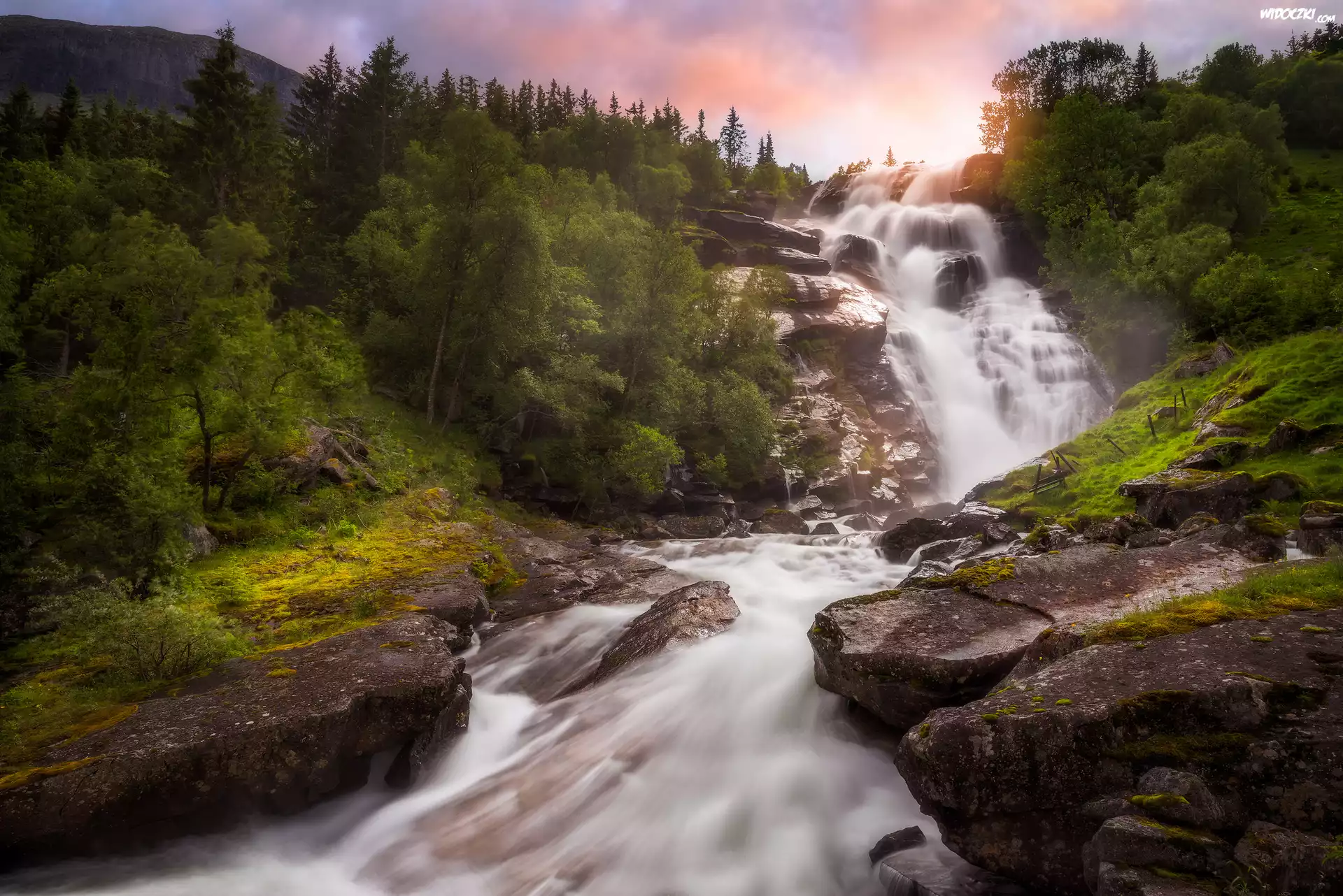 Zdjęcia, Wodospad, Drzewa, Krzewy, Skały