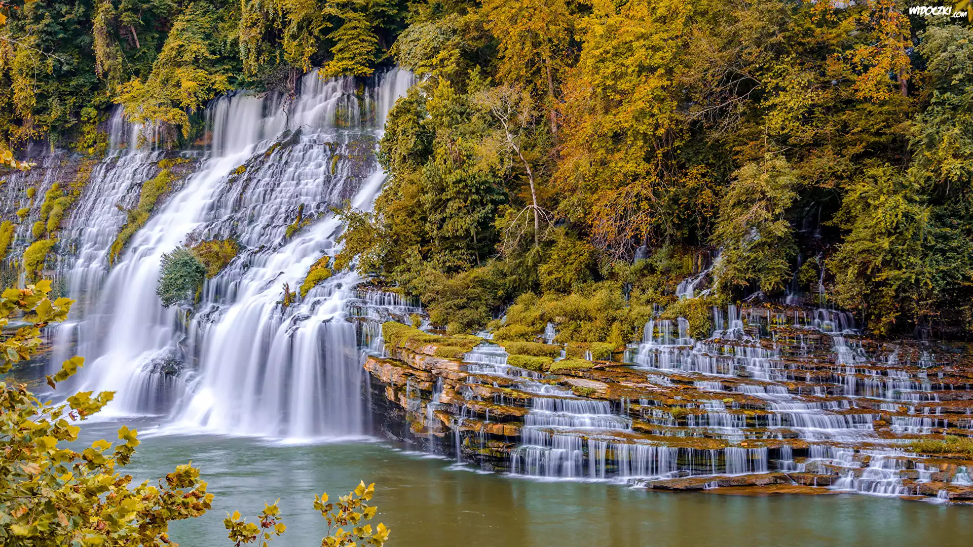 Wodospad Twin Falls, Park stanowy Rock Island State Park, Stan Tennessee, Stany Zjednoczone, Drzewa, Krzewy, Skały |