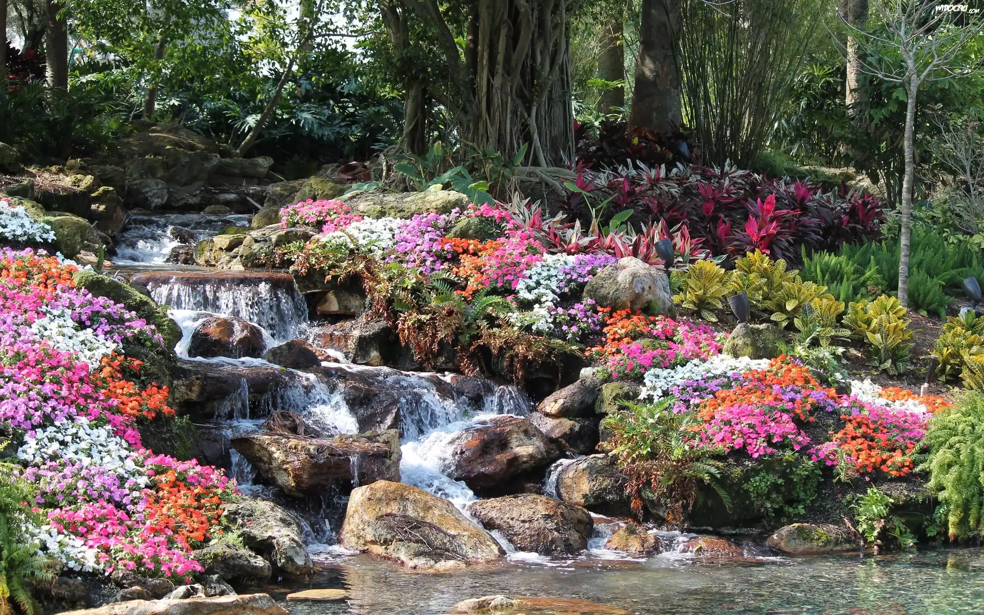 Zdjęcia, Wodospad, Las, Kwiaty, Kamienie