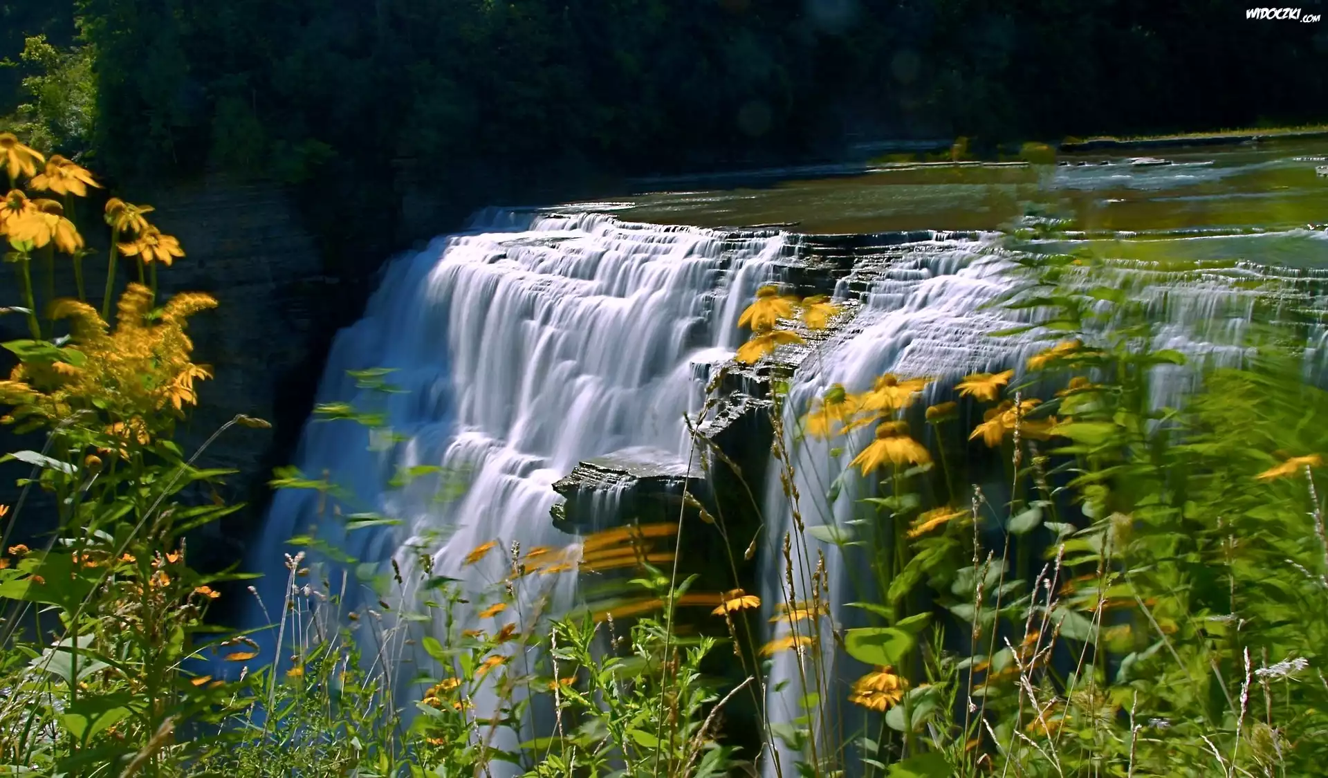 Zdjęcia, Wodospad, Skały, Kwiaty, Trawy