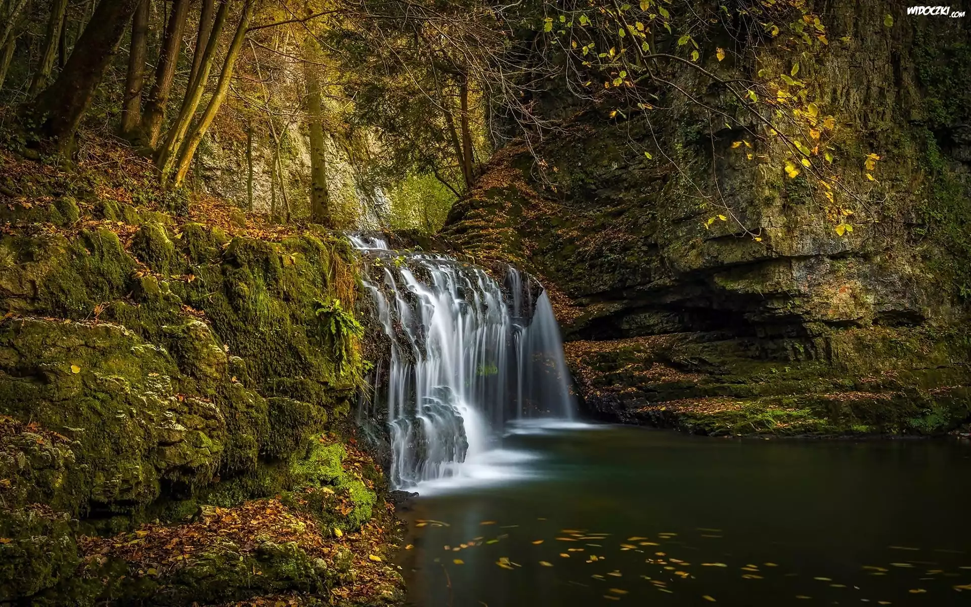 Zdjęcia, Wodospad, Rzeka, Omszałe, Skały, Las, Jesień