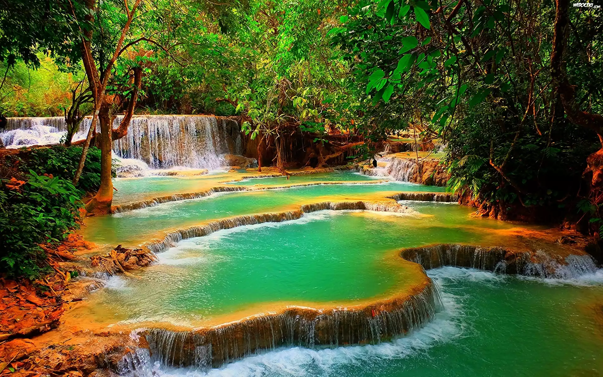 Wodospad, Kuang Si, Drzewa, Las, Laos