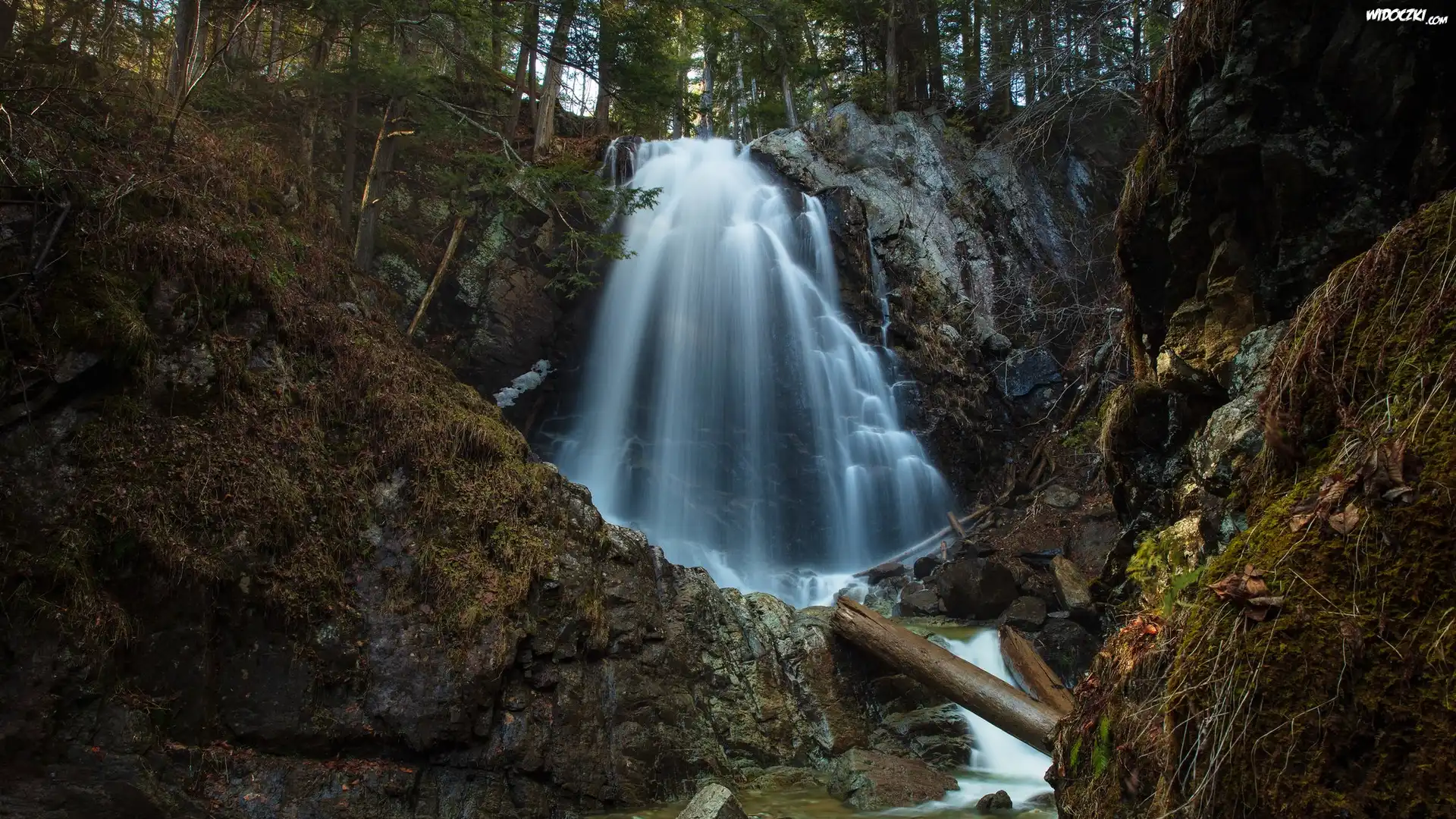Zdjęcia, Las, Drzewa, Skały, Wodospad