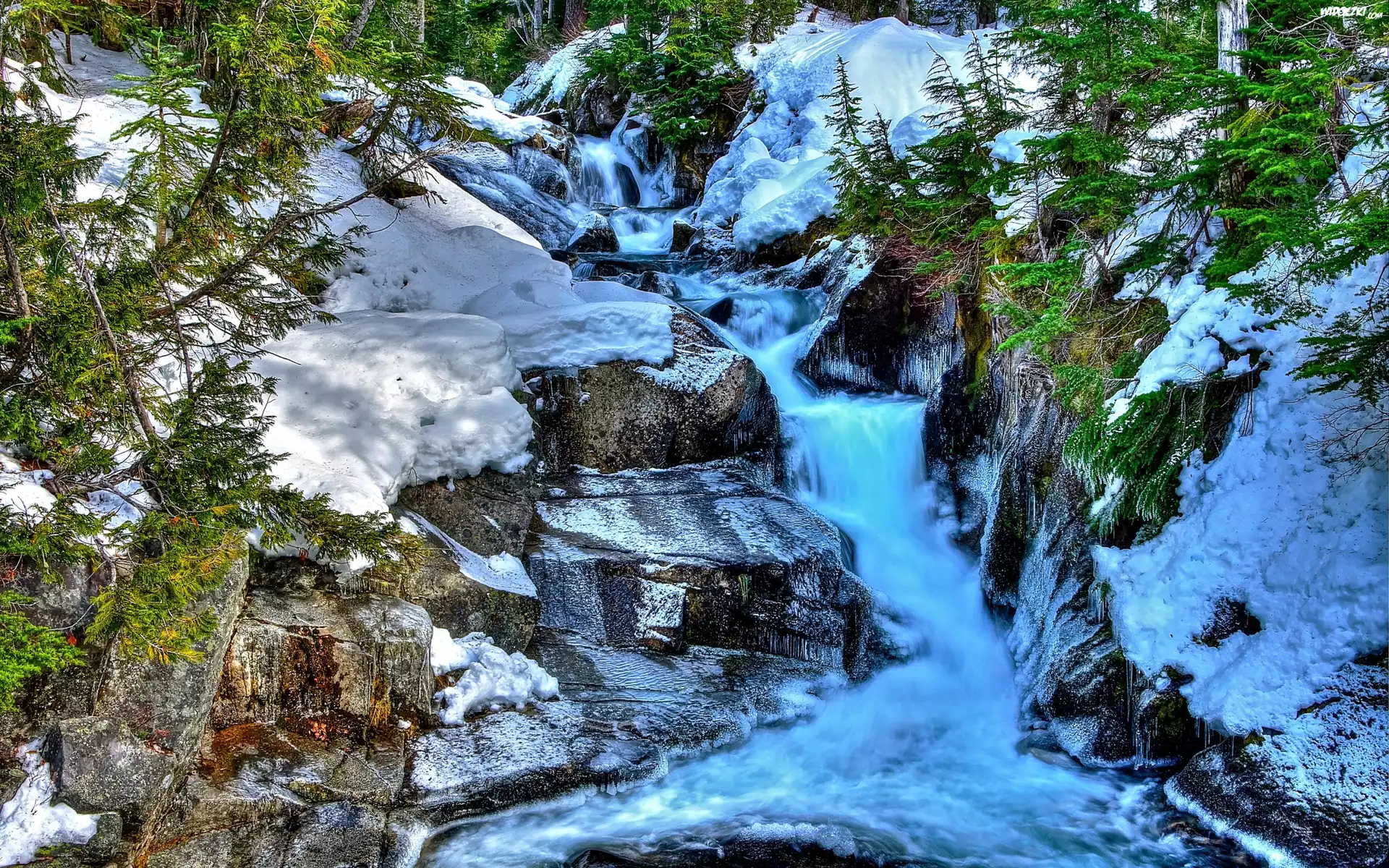 Zdjęcia, Wodospad, Skały, Las, Zima