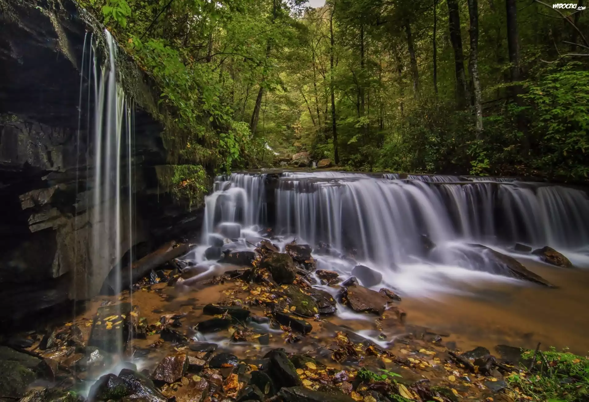 Zdjęcia, Wodospad, Las, Skały, Kamienie, Liście, Jesień