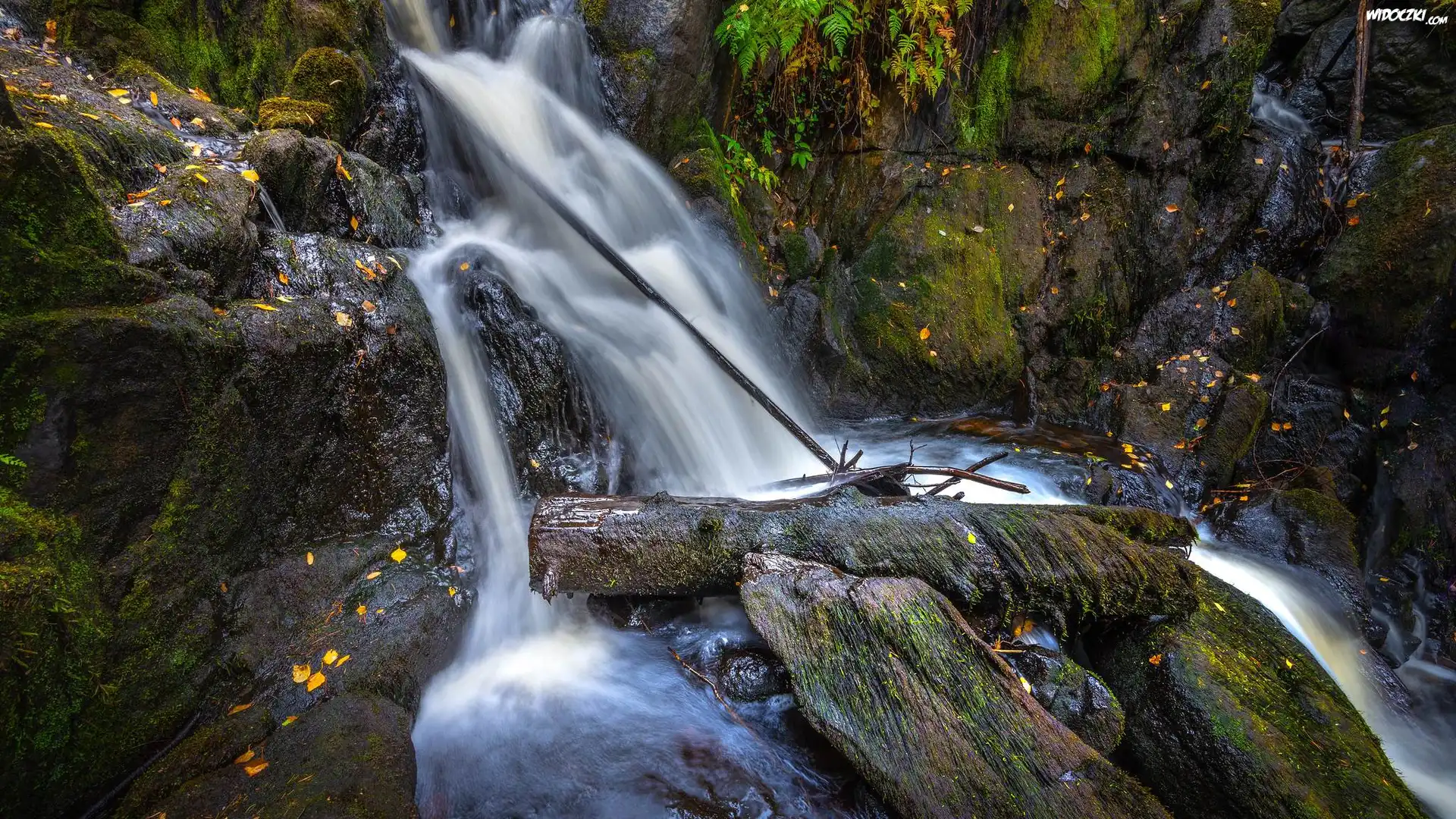 Zdjęcia, Wodospad, Skały, Liście, Kamienie