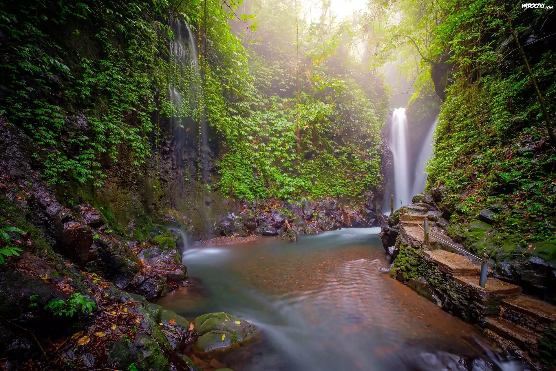 Zdjęcia, Wodospad, Rzeka, Skały, Podest, Mgła, Roślinność
