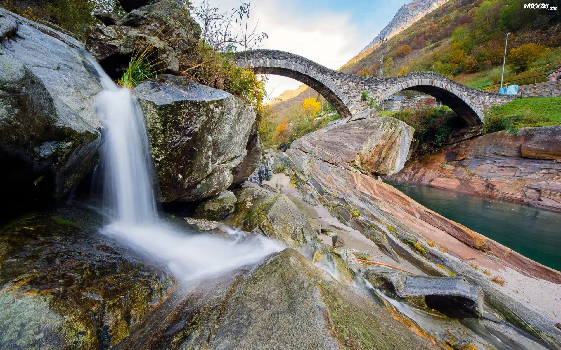 Zdjęcia, Wodospad, Skały, Rzeka, Most, Góry