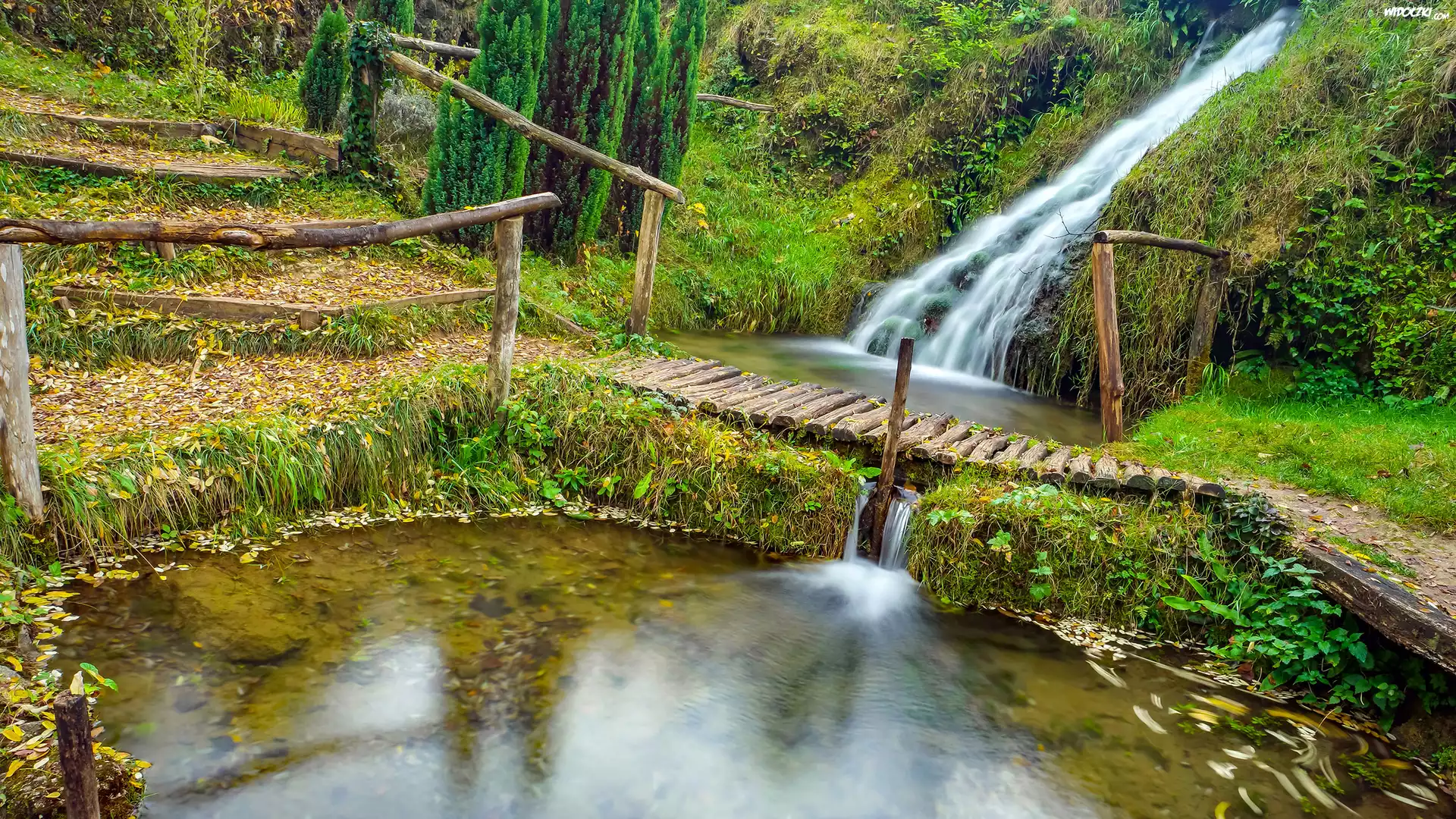 Wodospad, Staw, Mostek, Park