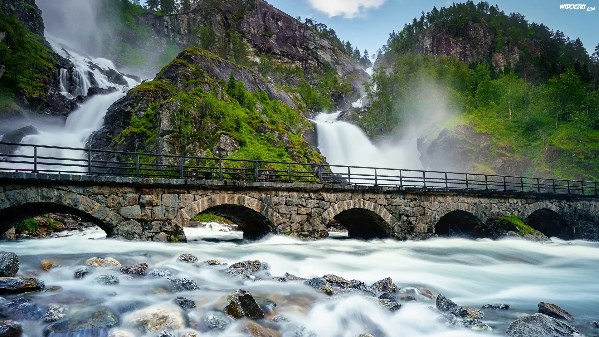 Wodospad Latefossen, Kamienny, Most, Rzeka, Kamienie, Góry, Skały, Las, Drzewa, Zachód słońca, Gmina Odda, Norwegia |