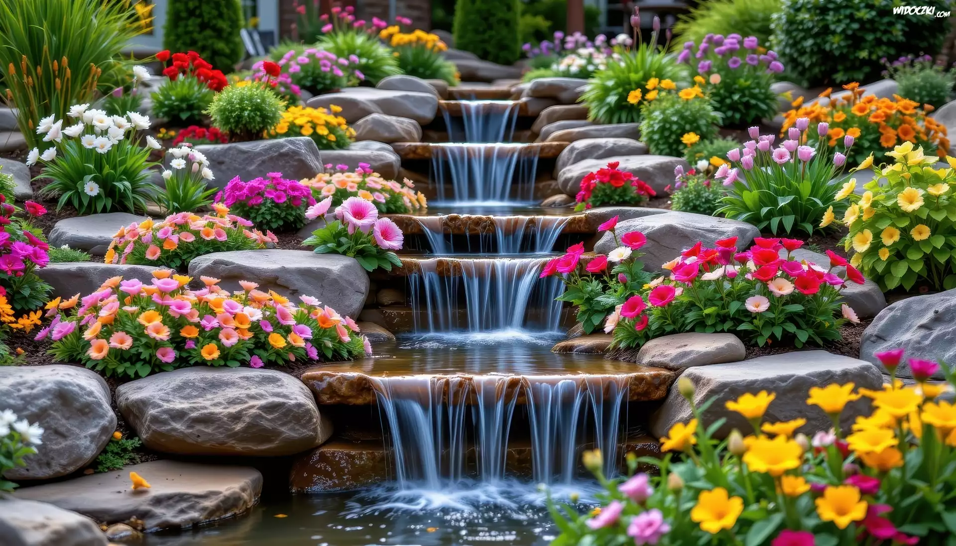 Zdjęcia, Ogród, Kwiaty, Kamienie, Wodospad