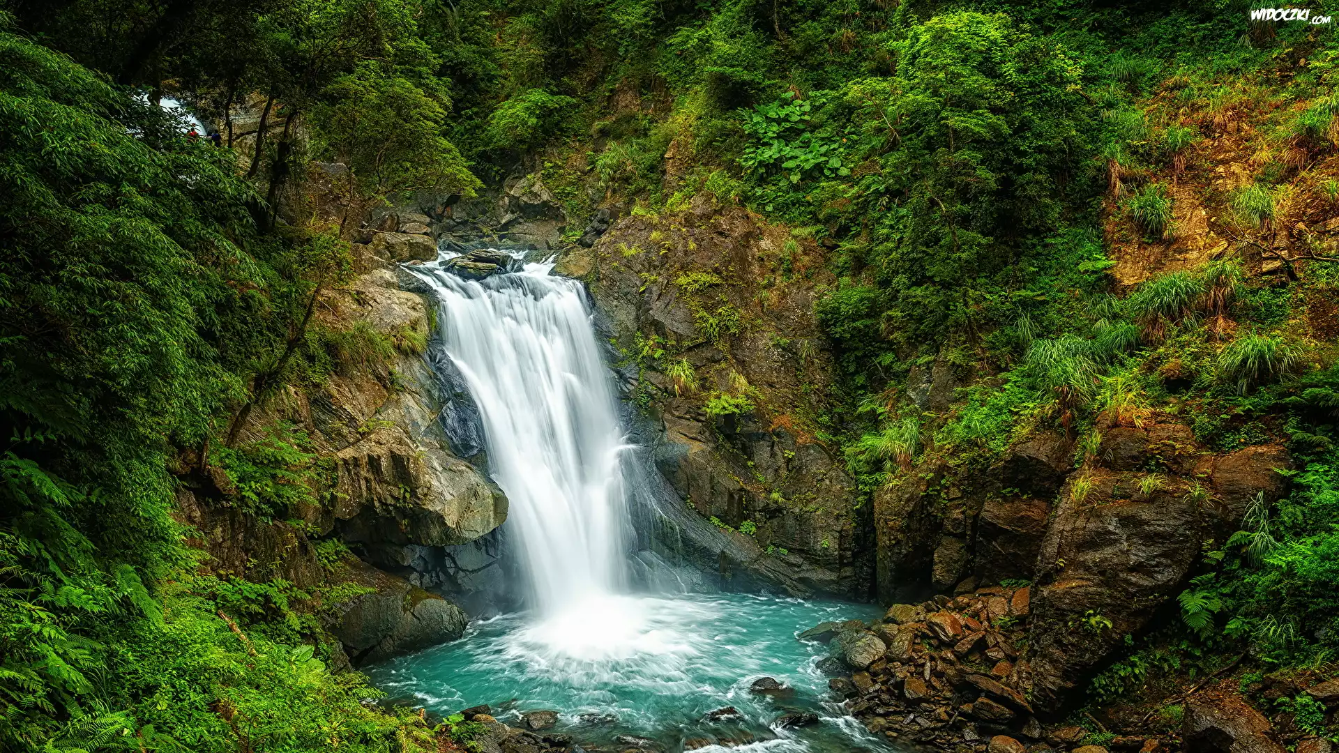 Wodospad Neidong Falls, Omszałe, Skały, Krzewy, Drzewa, Roślinność, Dzielnica Wulai, Nowe Tajpej, Tajwan |