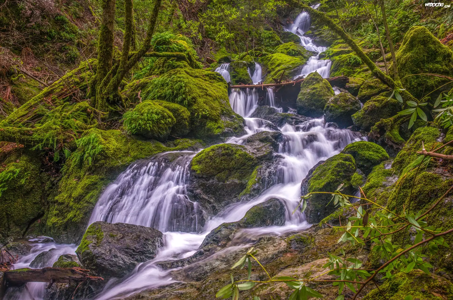 Zdjęcia, Potok, Wodospad, Omszone, Kamienie, Drzewa