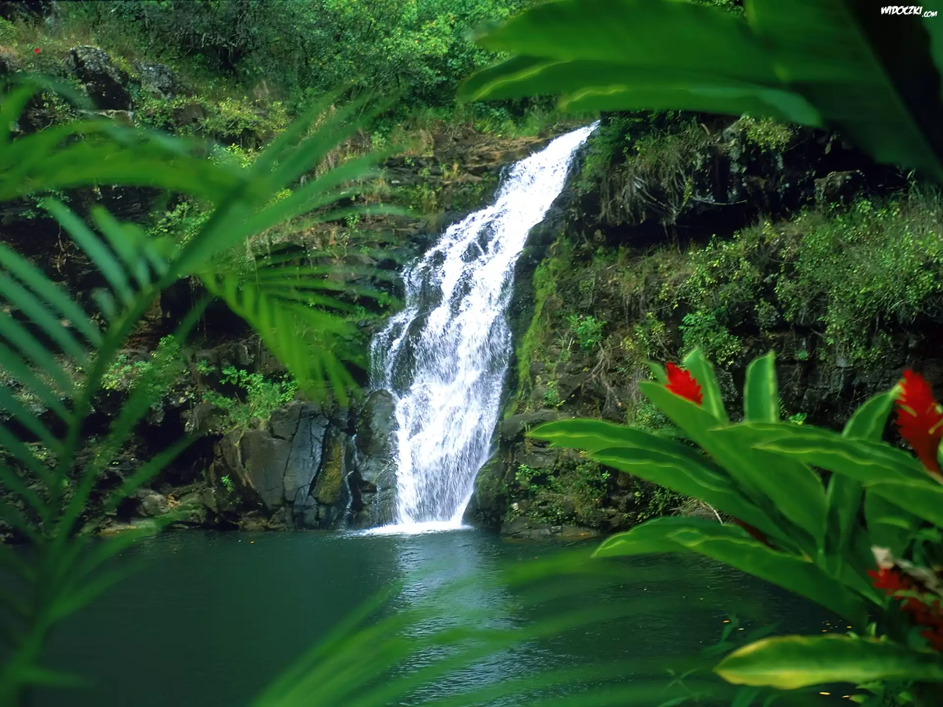 Wodospad, Czerwone, Kwiaty, Palmy, Rośliny