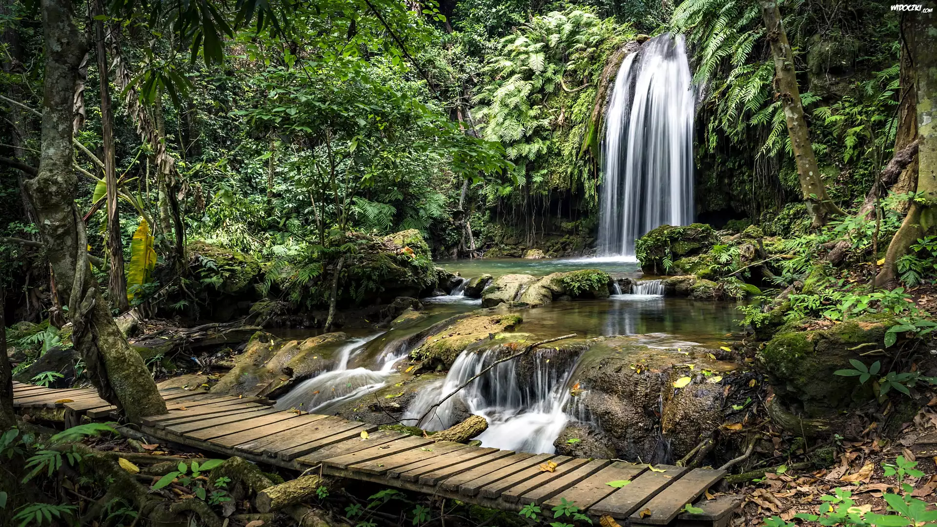 Zdjęcia, Wodospad, Kładka, Las, Paprocie, Roślinność