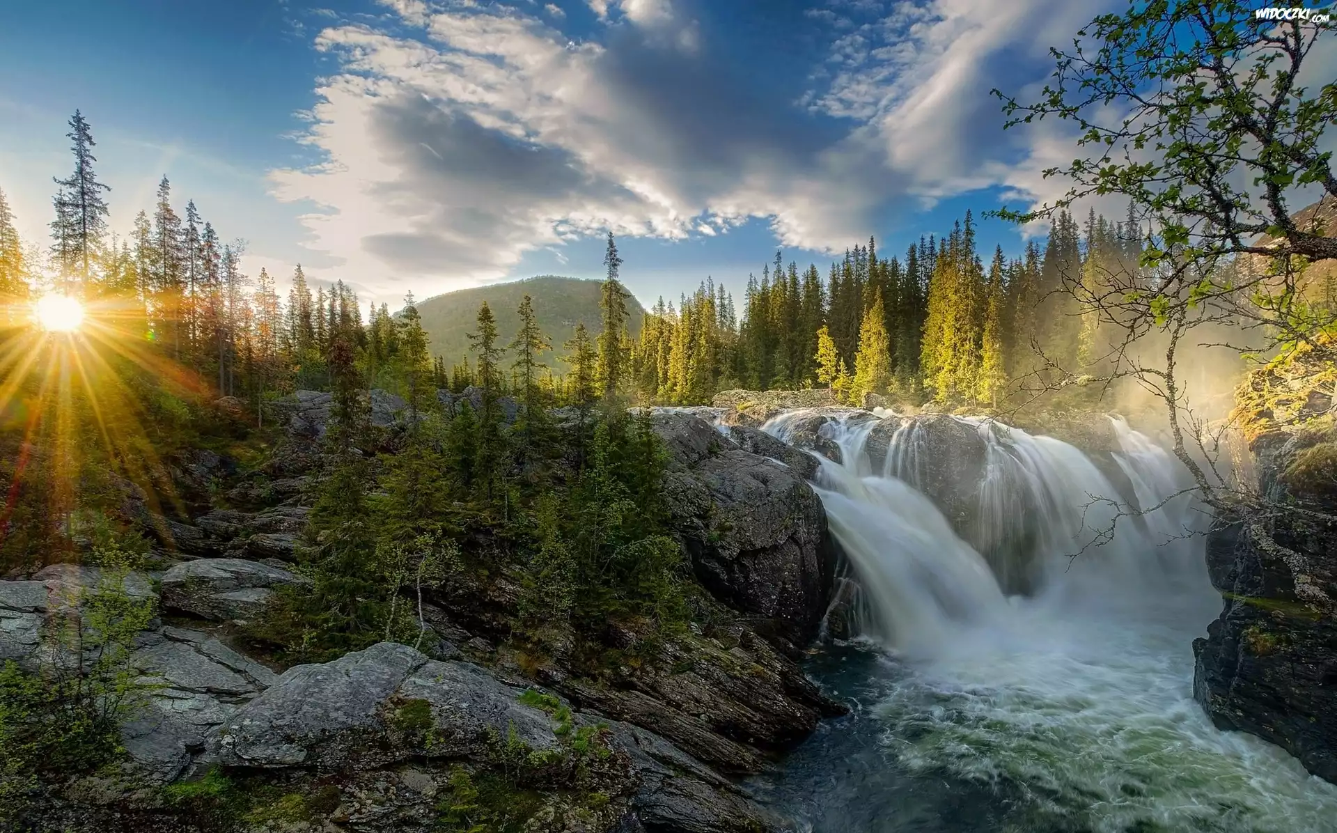 Zdjęcia, Wodospad, Kamienie, Promienie słońca
