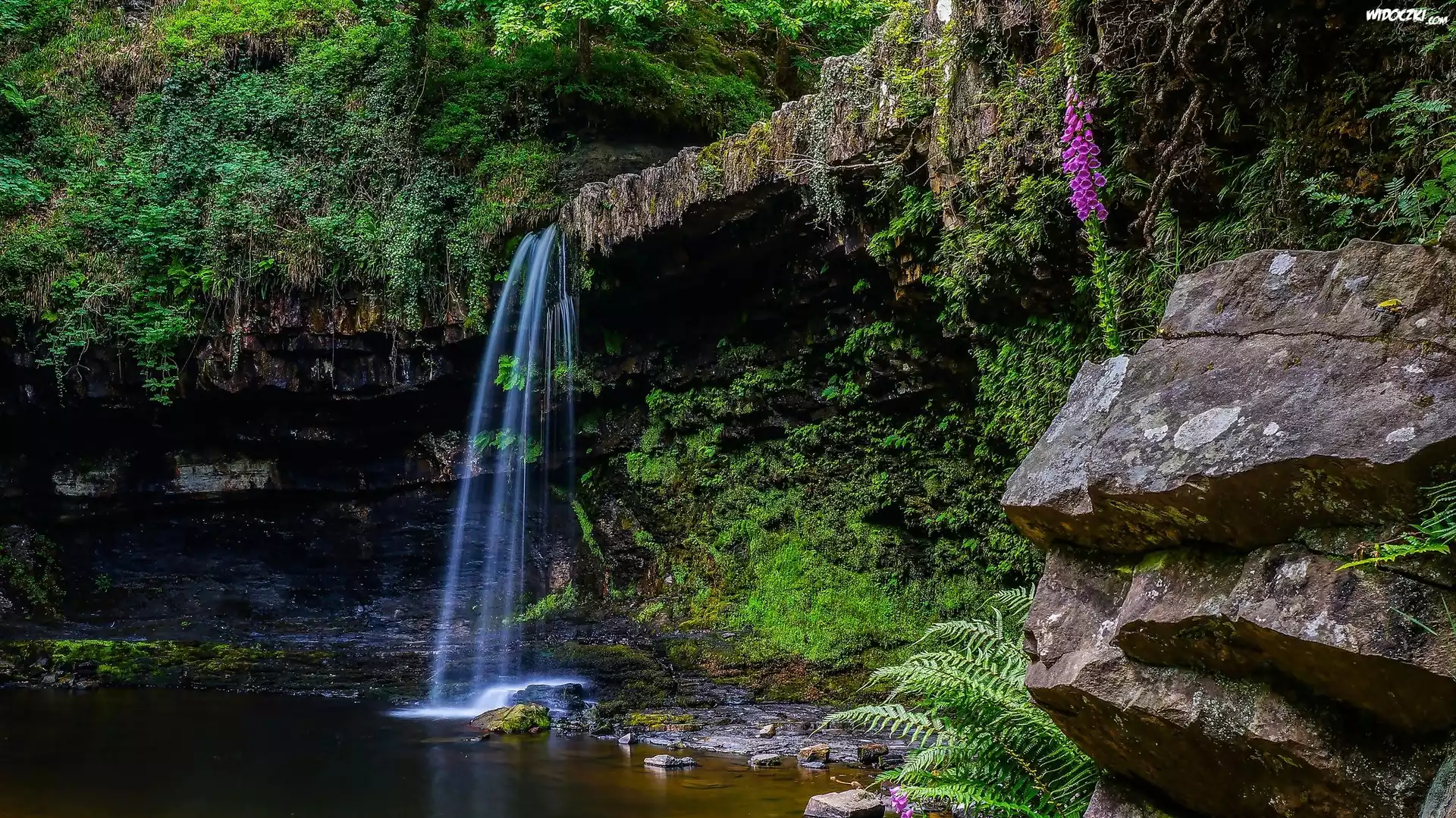 Wodospad, Skały, Drzewa, Roślinność, Kwiat