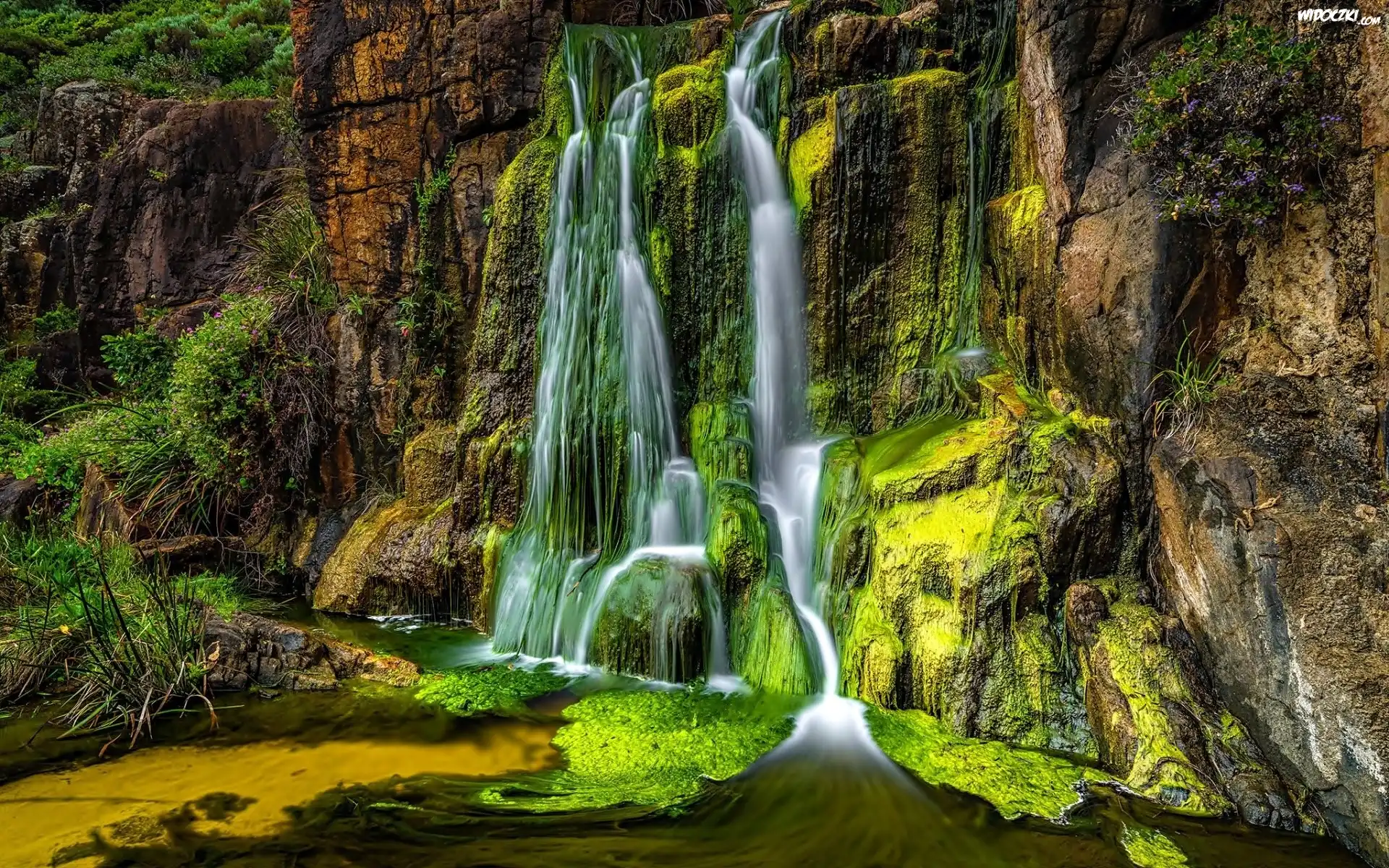 Wodospad, Skały, Roślinność, Jezioro