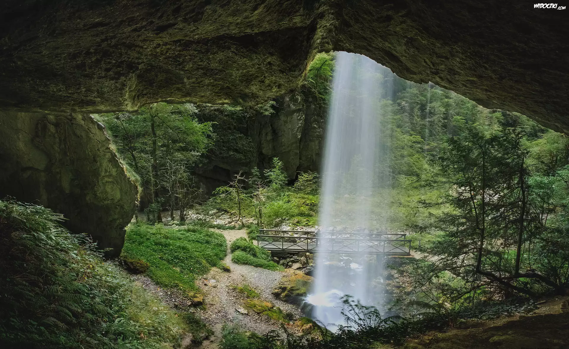 Wodospad, Skały, Mostek, Rośliny, Drzewa
