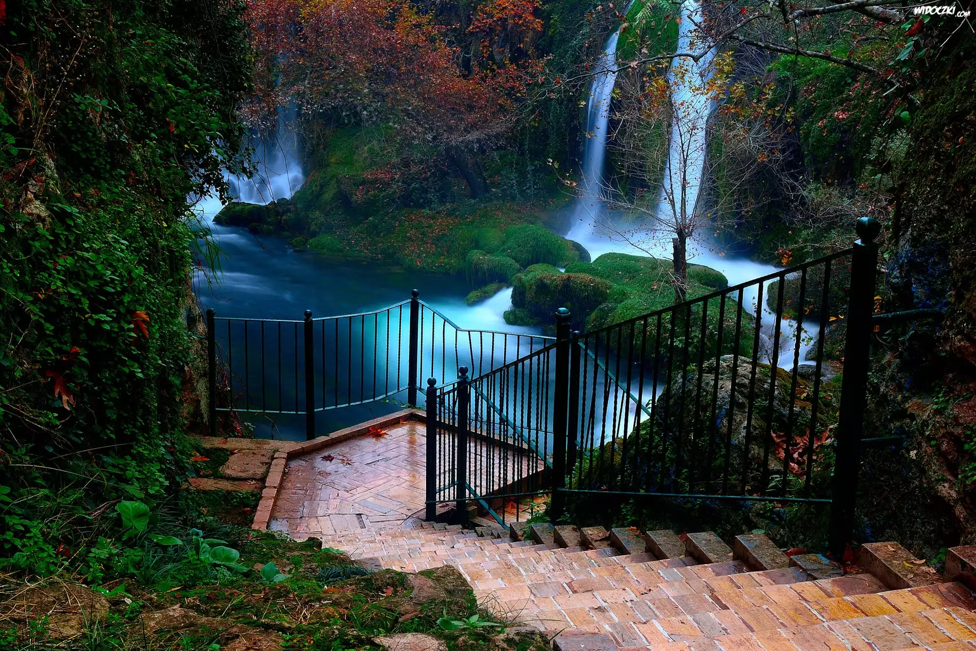 Zdjęcia, Wodospad, Rzeka, Rośliny, Schody