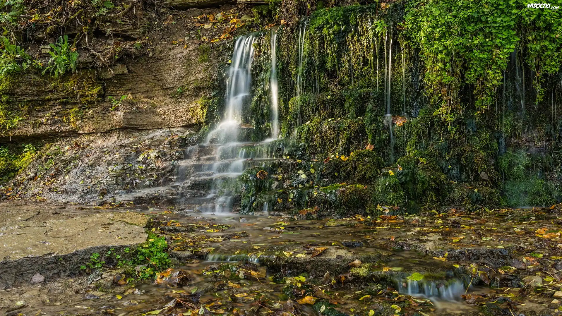Zdjęcia, Wodospad, Skały, Rośliny, Liście