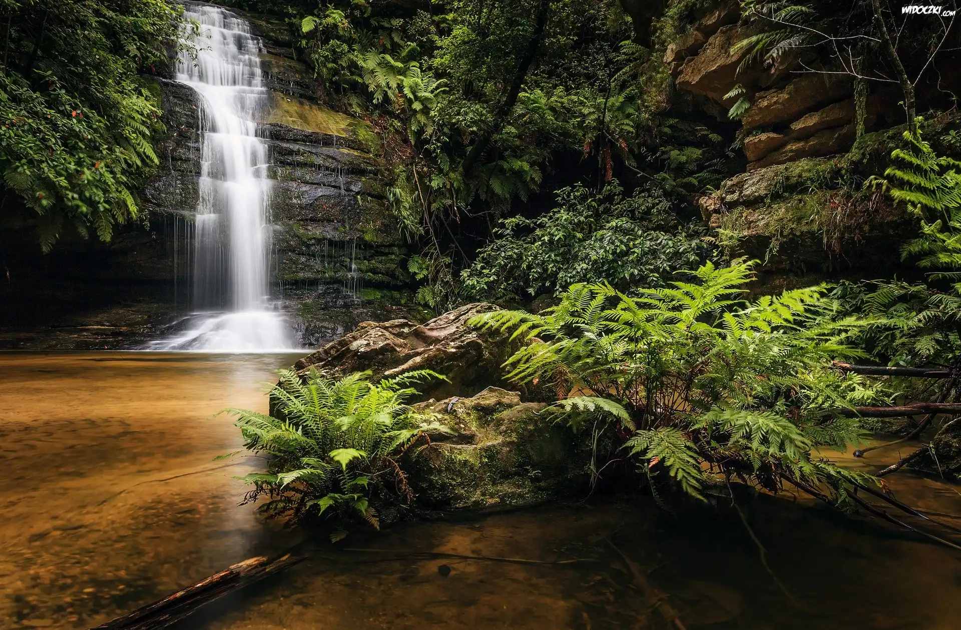 Zdjęcia, Wodospad, Skały, Rośliny, Paprocie