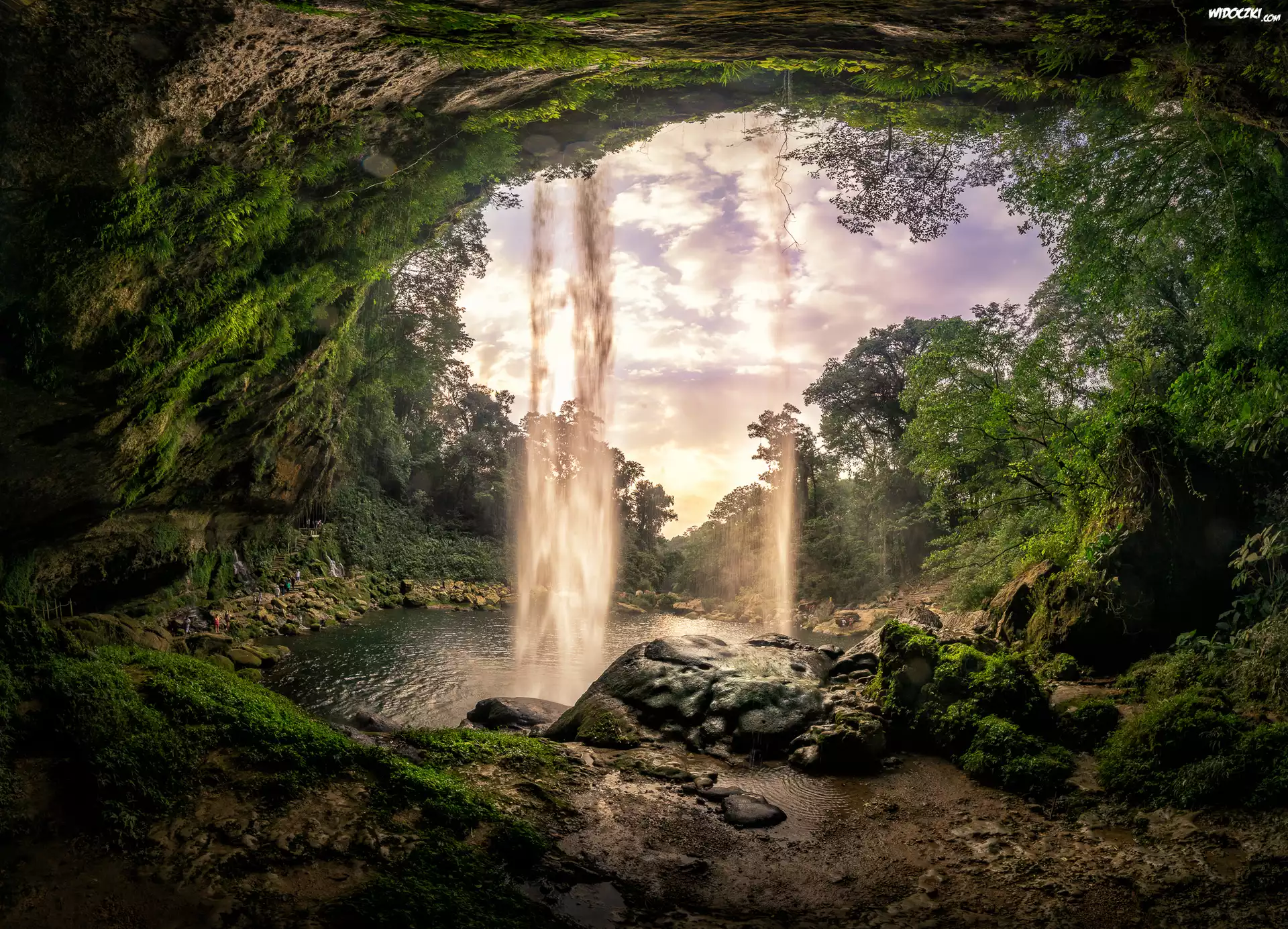 Zdjęcia, Wodospad, Drzewa, Skały, Jaskinia, Rybie oko