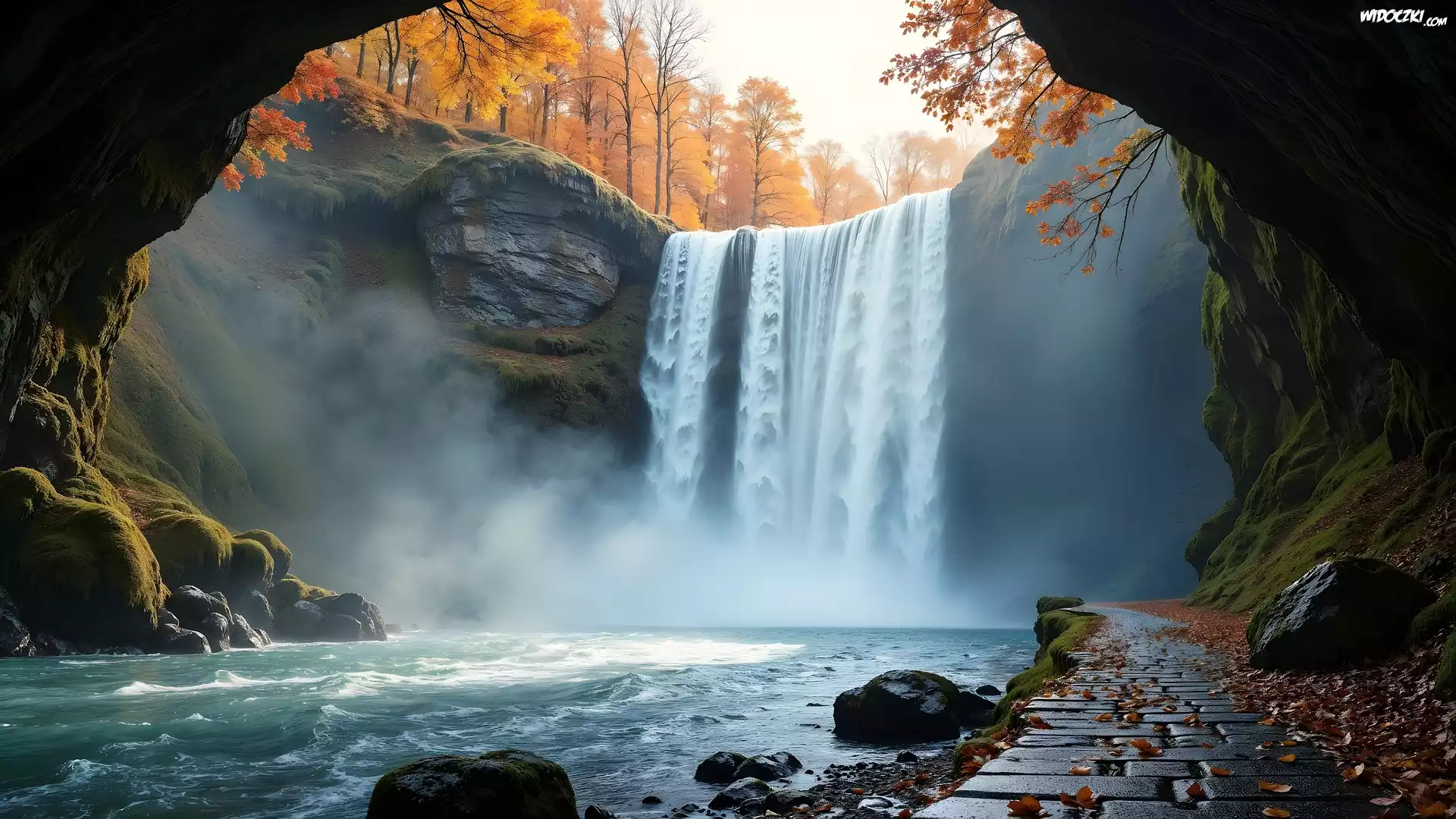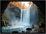 Jesień, Wodospad, Rzeka, Skały, Drzewa