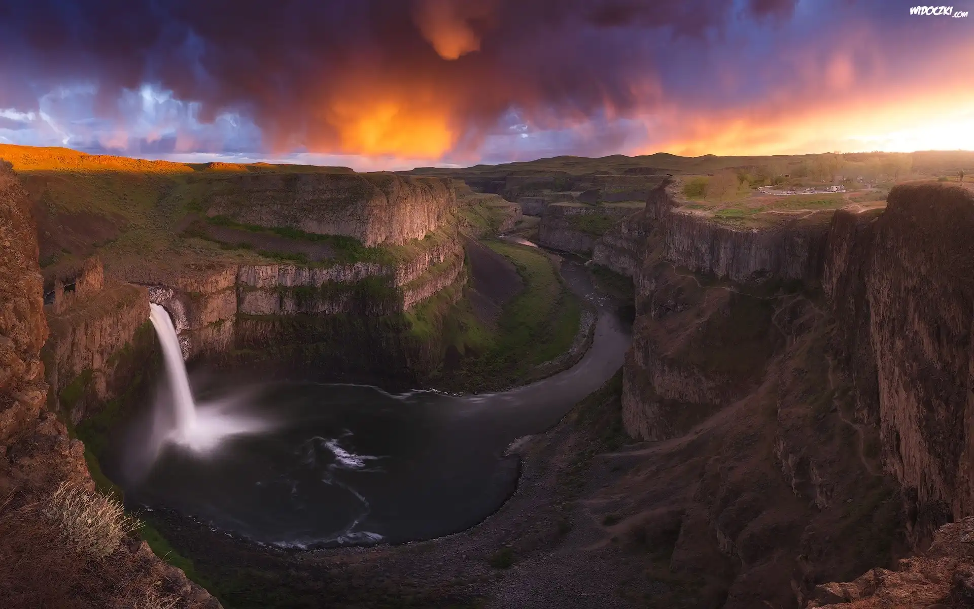 Stany Zjednoczone, Stan Waszyngton, Wyżyna Kolumbii, Wodospad, Palouse Falls, Rzeka, Palouse River, Skały, Zachód słońca, Chmury |