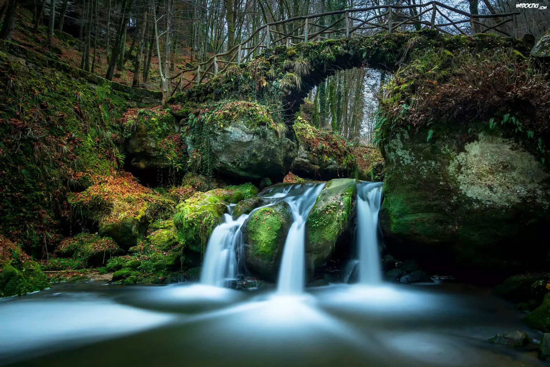 Las, Drzewa, Wodospad Schiessentumpel, Rzeka, Most, Skały, Mała Szwajcaria, Mullerthal, Luksemburg |