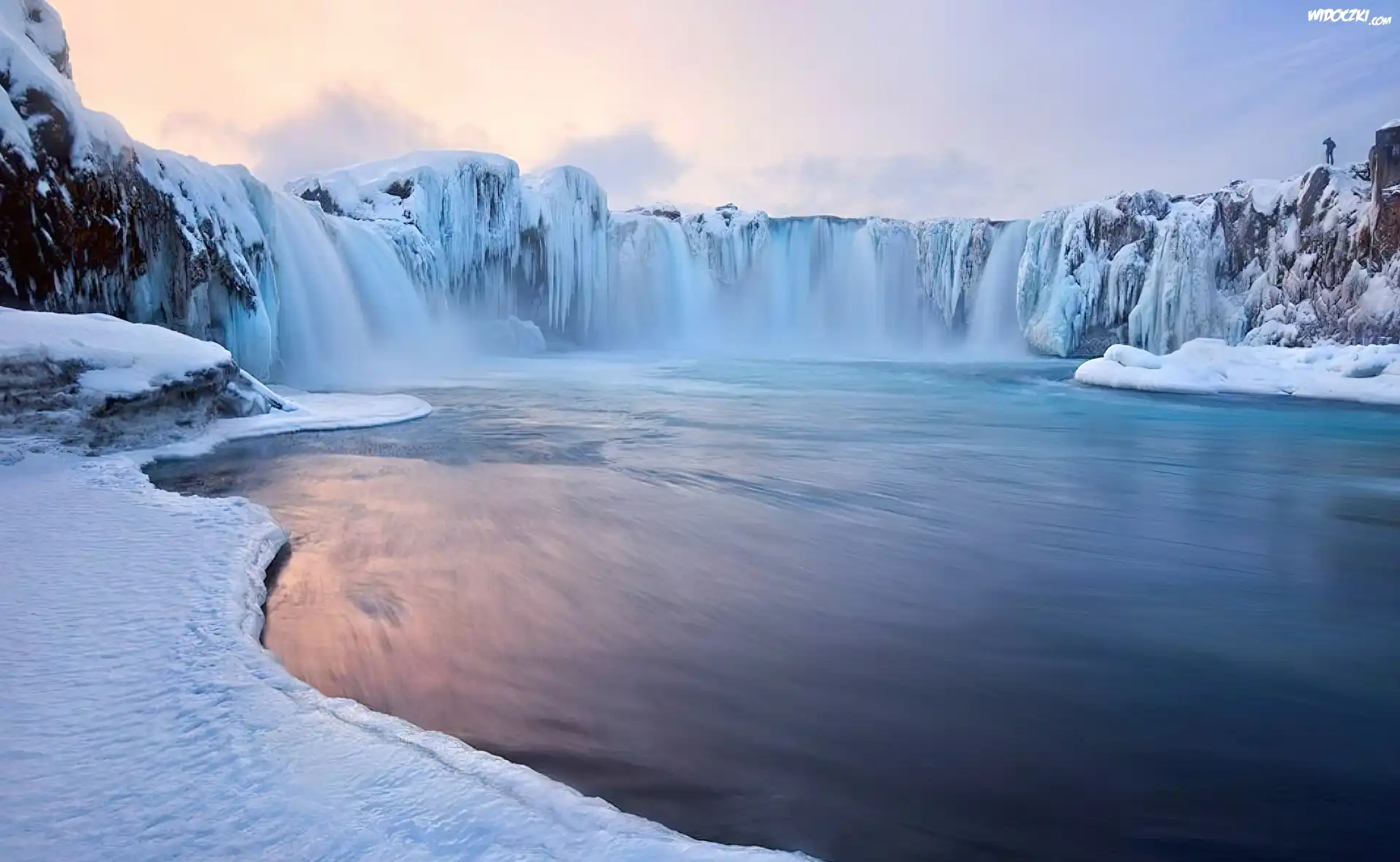 Zdjęcia, Rzeka, Wodospad Godafoss, Islandia, Zima, Śnieg