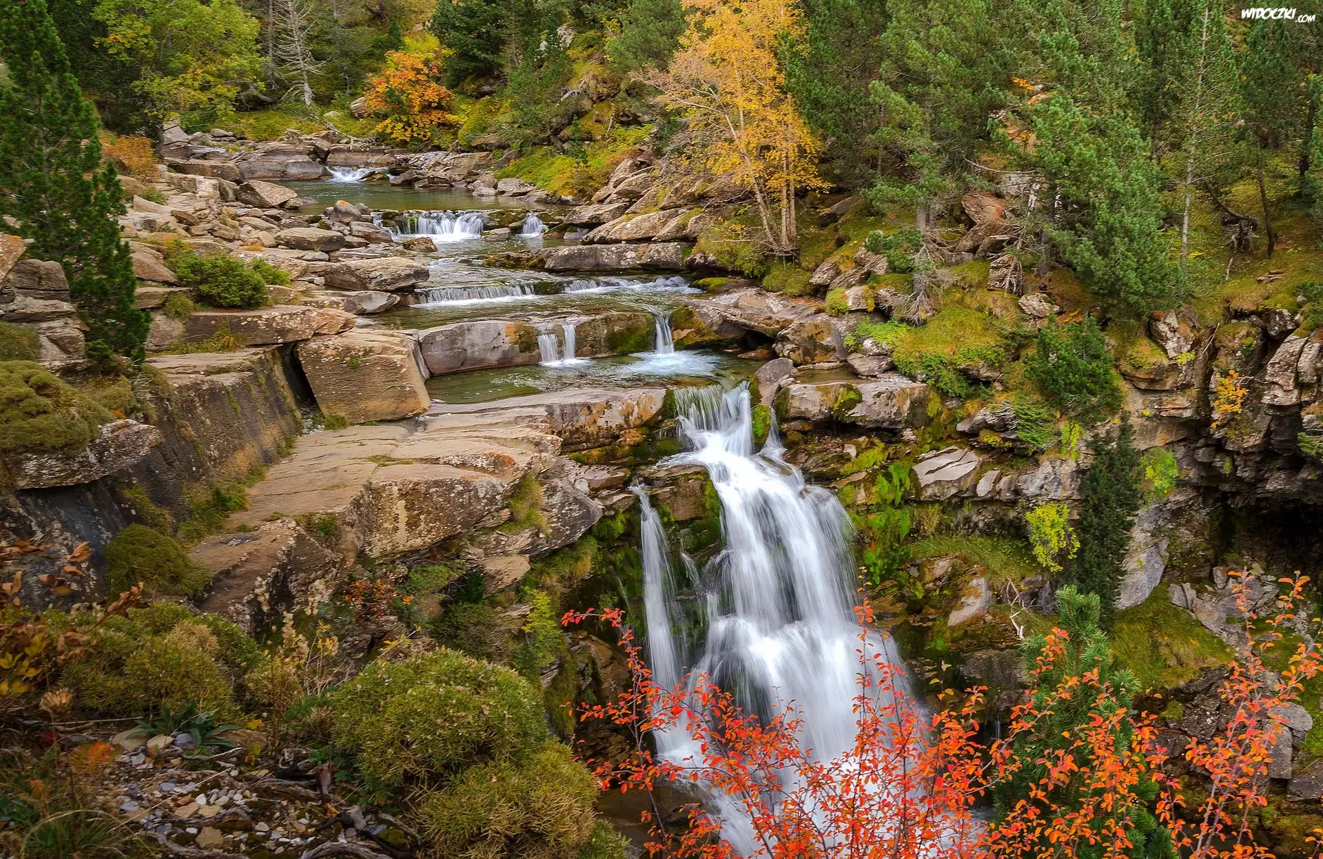 Zdjęcia, Wodospad, Rzeka, Kamienie, Las, Skały, Drzewa
