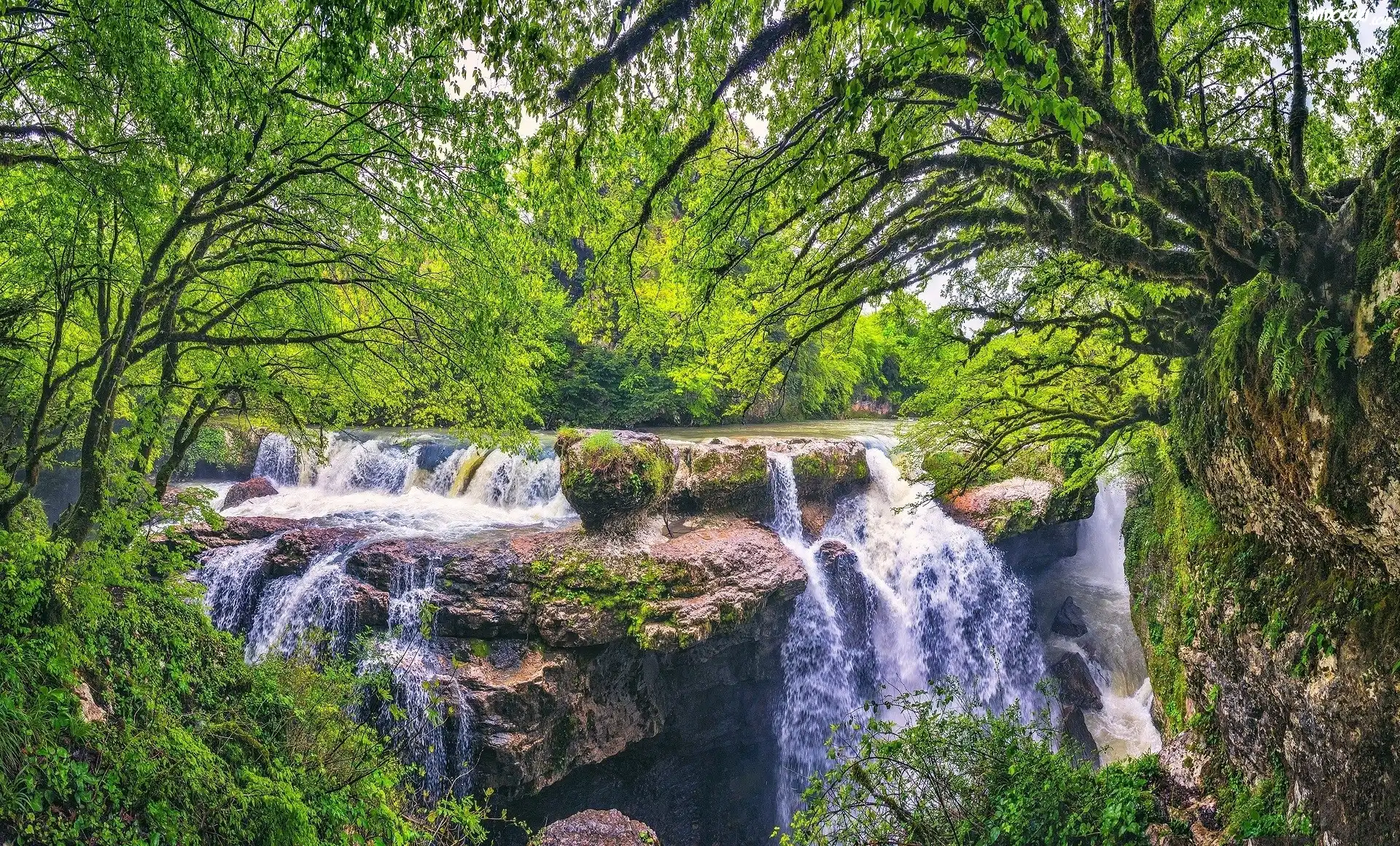 Wodospad, Las, Skały, Drzewa