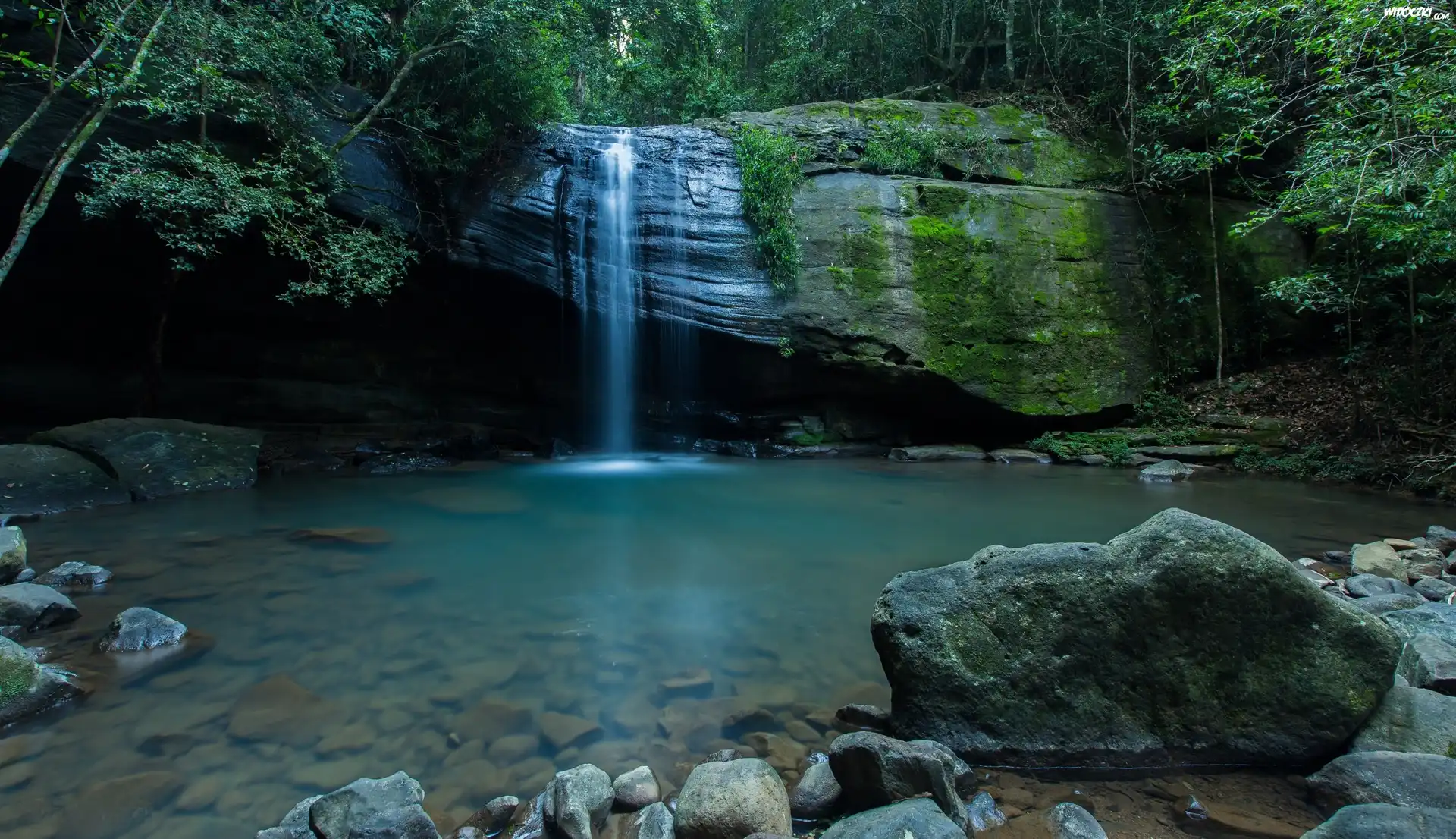 Wodospad, Las, Skały, Kamienie
