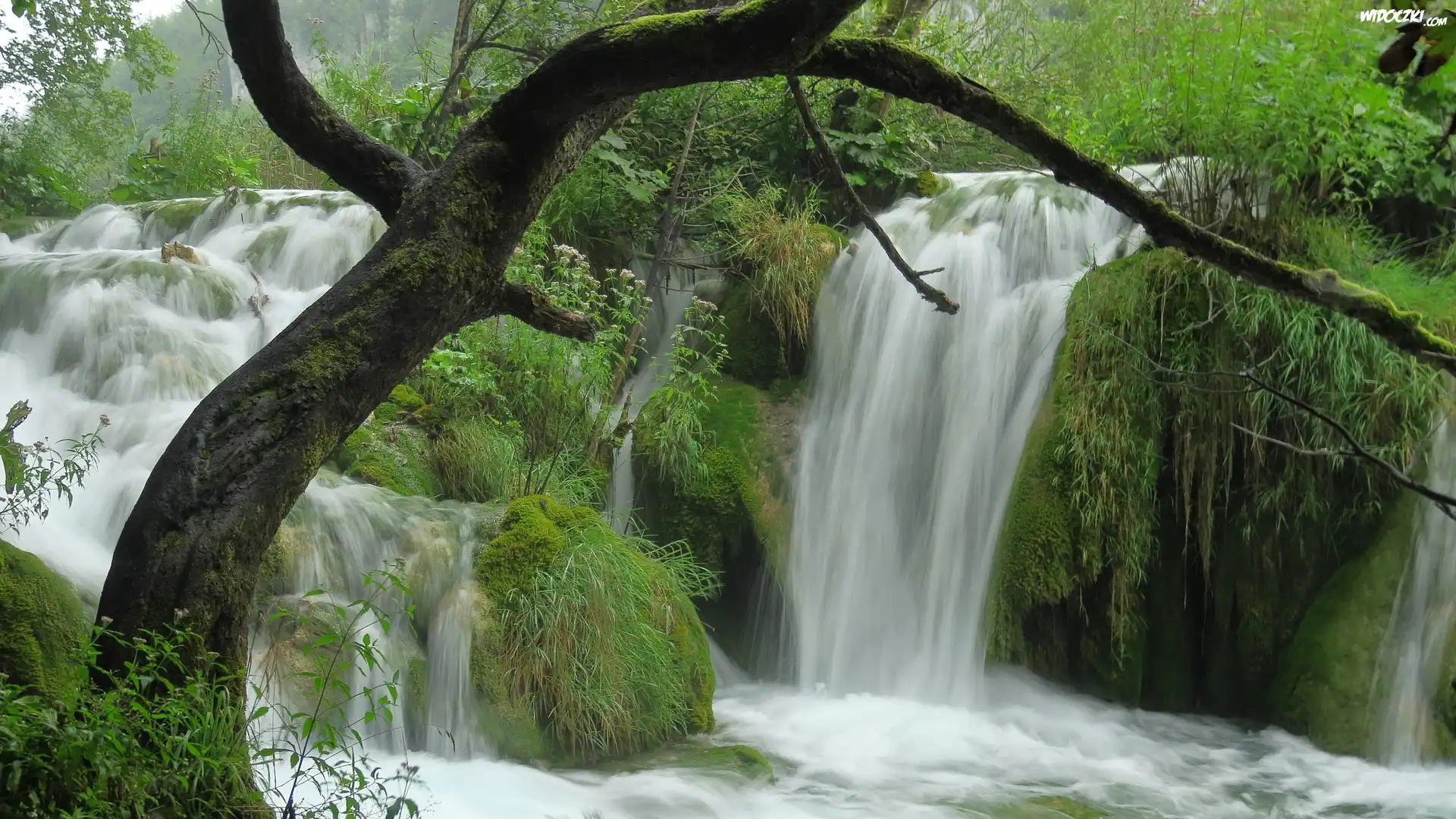 Zdjęcia, Wodospad, Omszałe, Skały, Drzewo