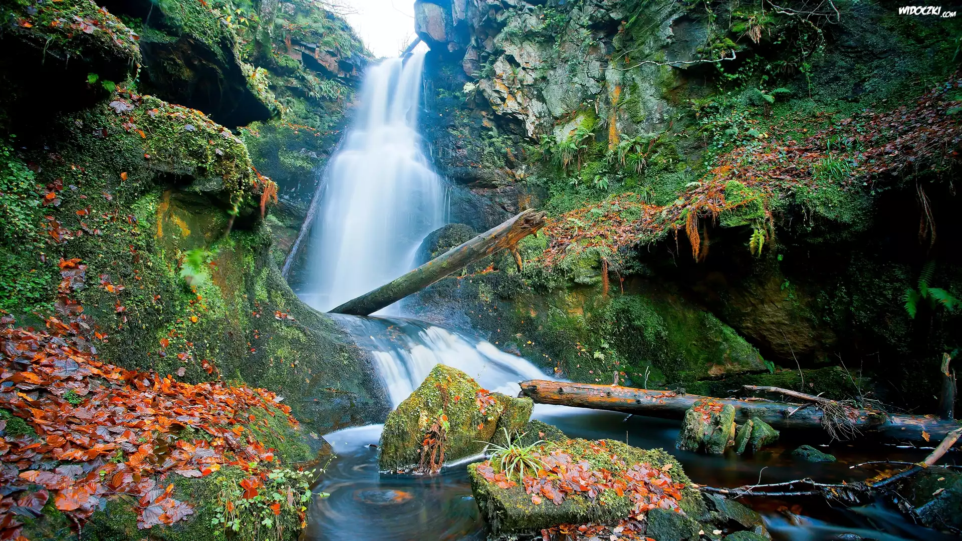 Wodospad Wodospad, Drzewa, Most Piękny Wodospad Krystalicznie, Czysta, Woda, Skały Góra, Skały Wodospad, Skały, Klif Wodospady Morze, Skały Wodospad Drzewa Wyżłobione, Koryto, Rzeki Wodospad, skały Rzeczka, Księżyc, Skały, Fantasy Wodospad Jesień Wodospad